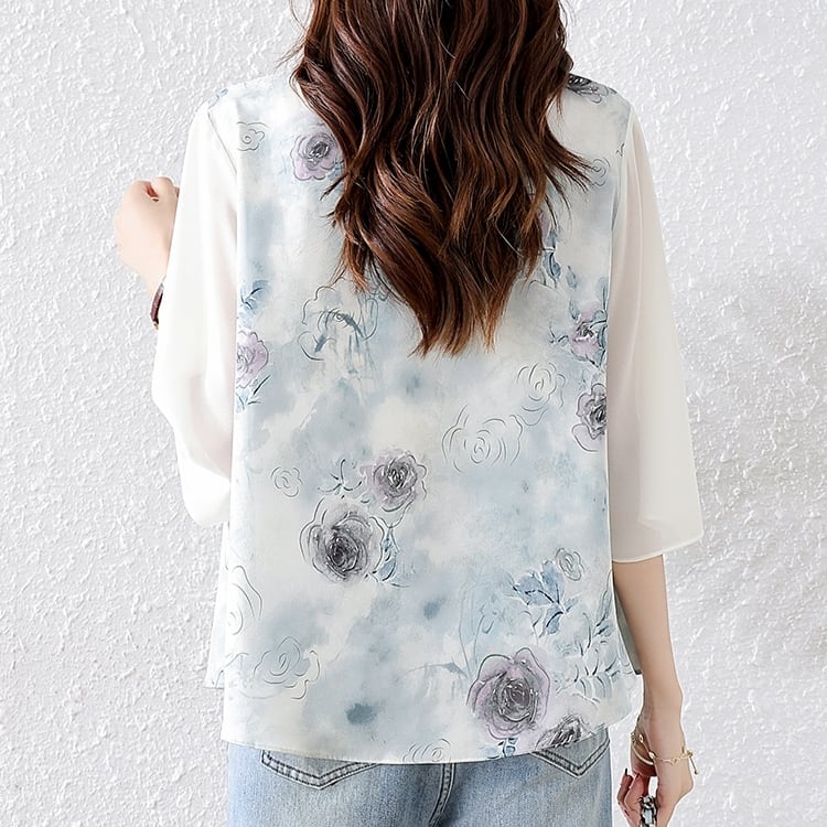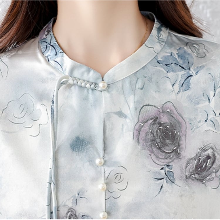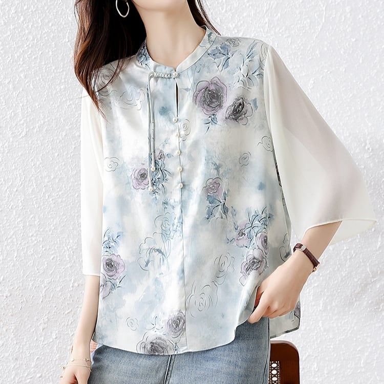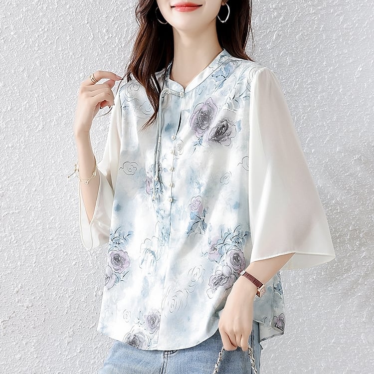 チャイナボタン花柄プリント 七分袖ブラウス YS00001