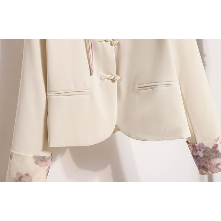 袖口の花柄が、控えめながらも女性らしさを添える、上品で洗練されたデザインです。