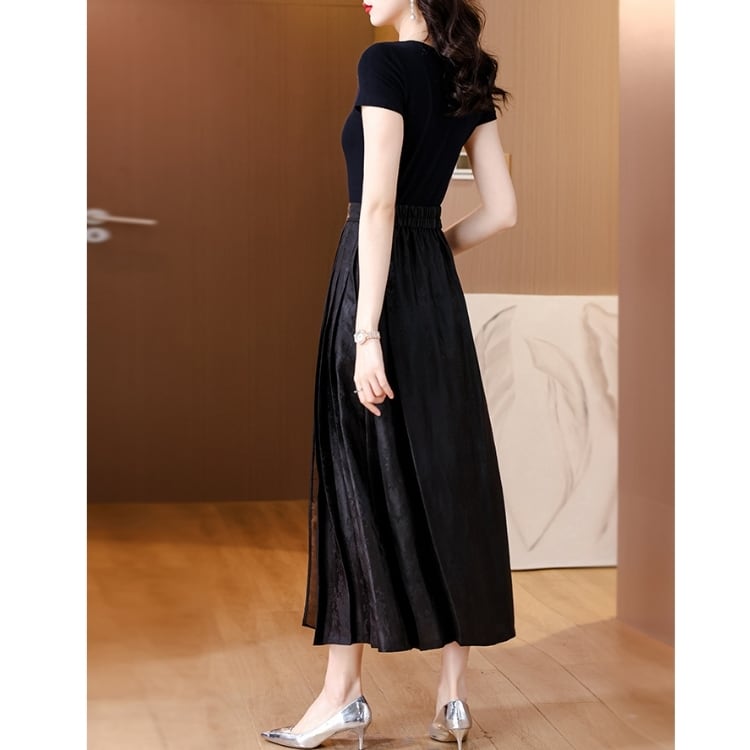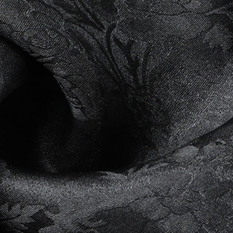 光沢感のある黒地に、優美な刺繍が映えるロングスカート。