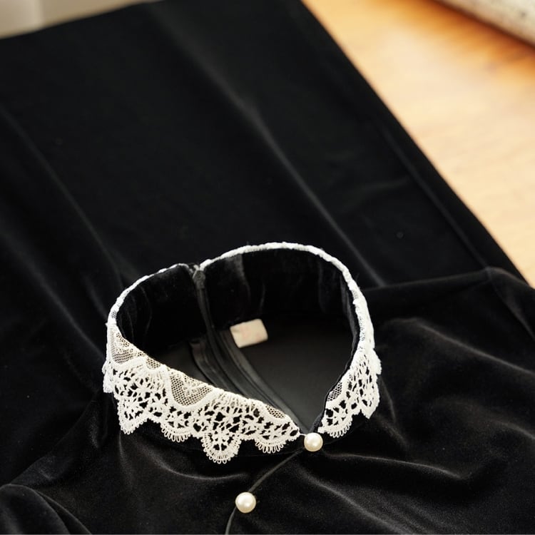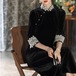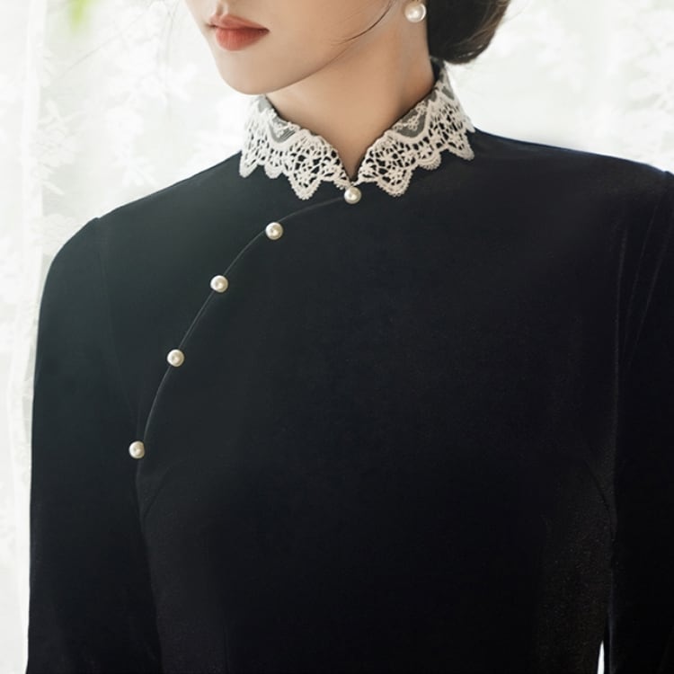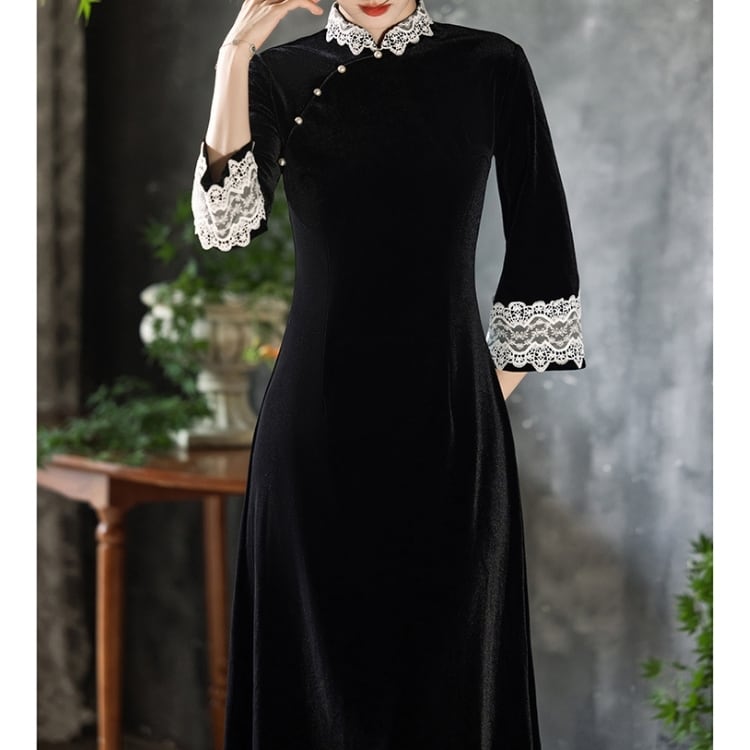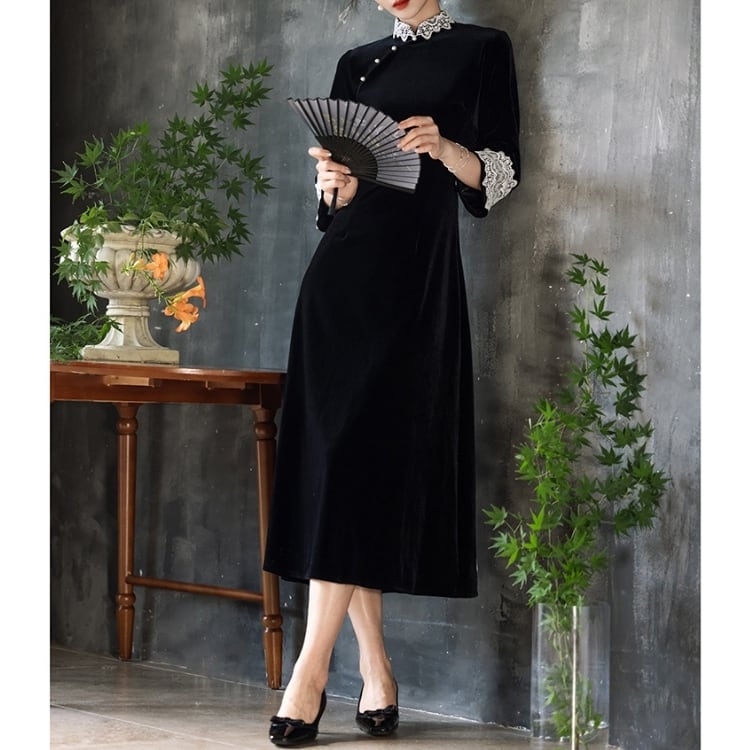深みのあるベルベット調の生地に、レース襟と袖口が上品に映えるチャイナワンピース。