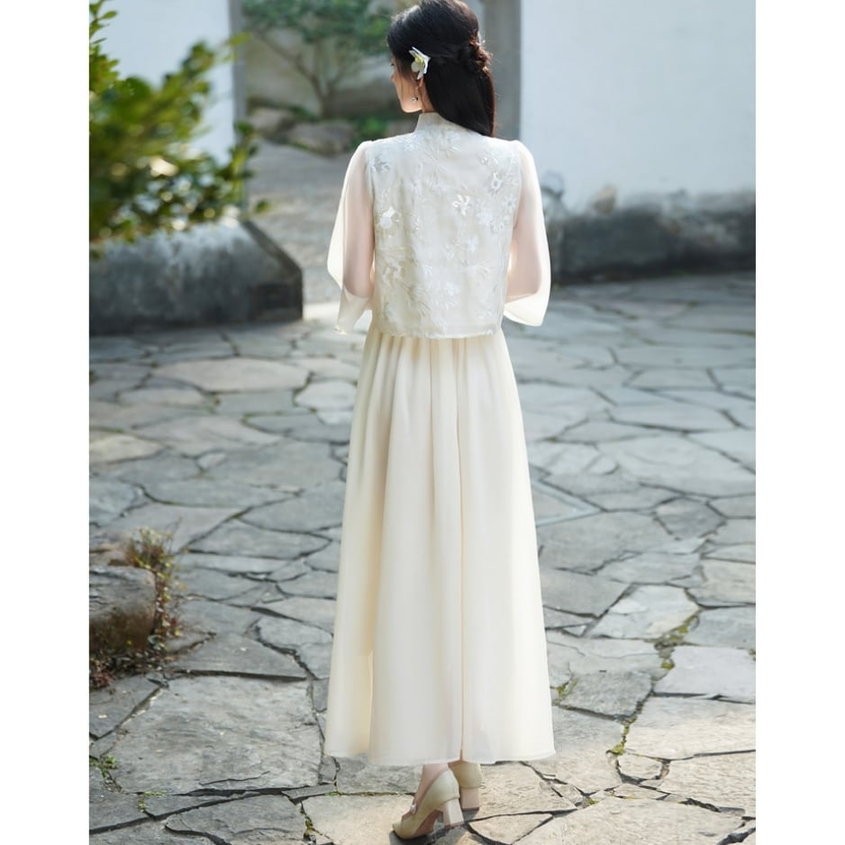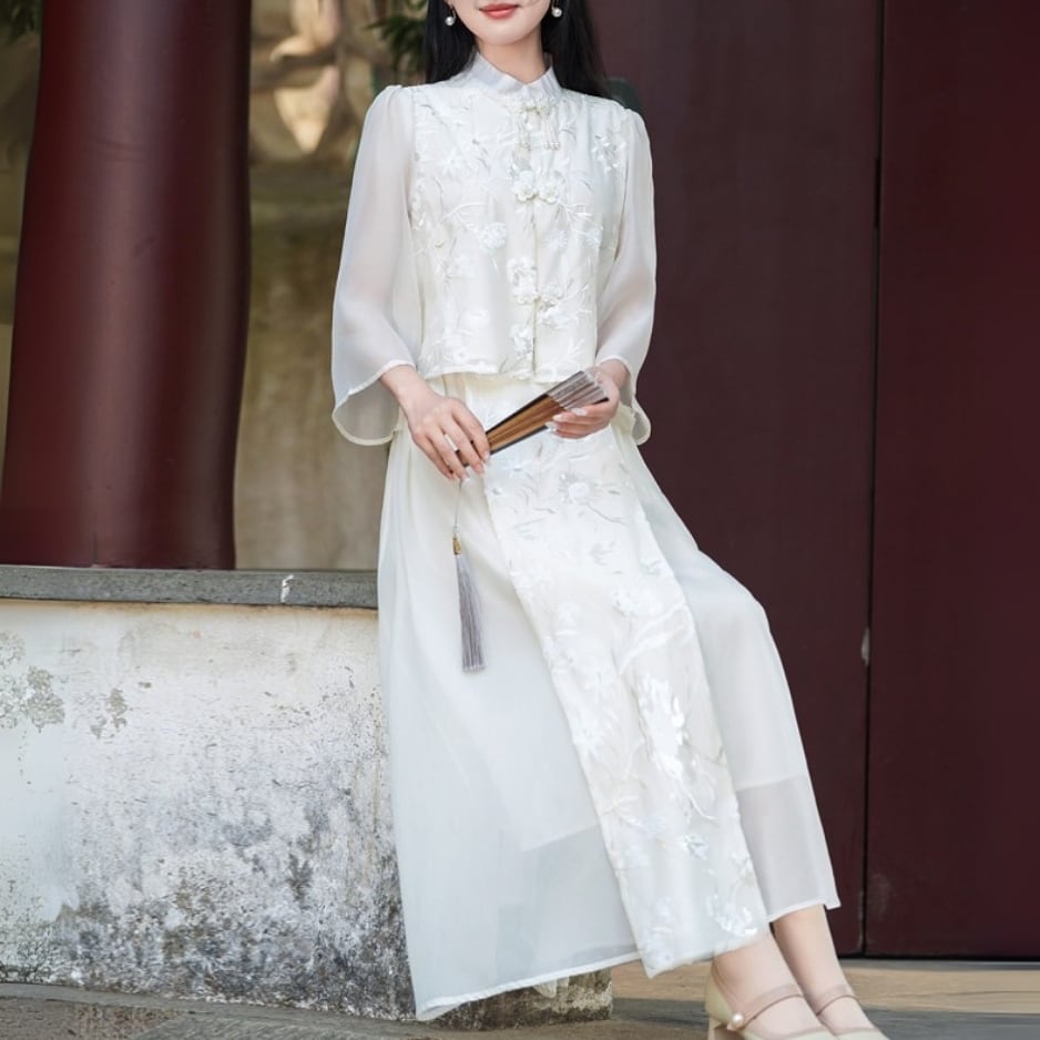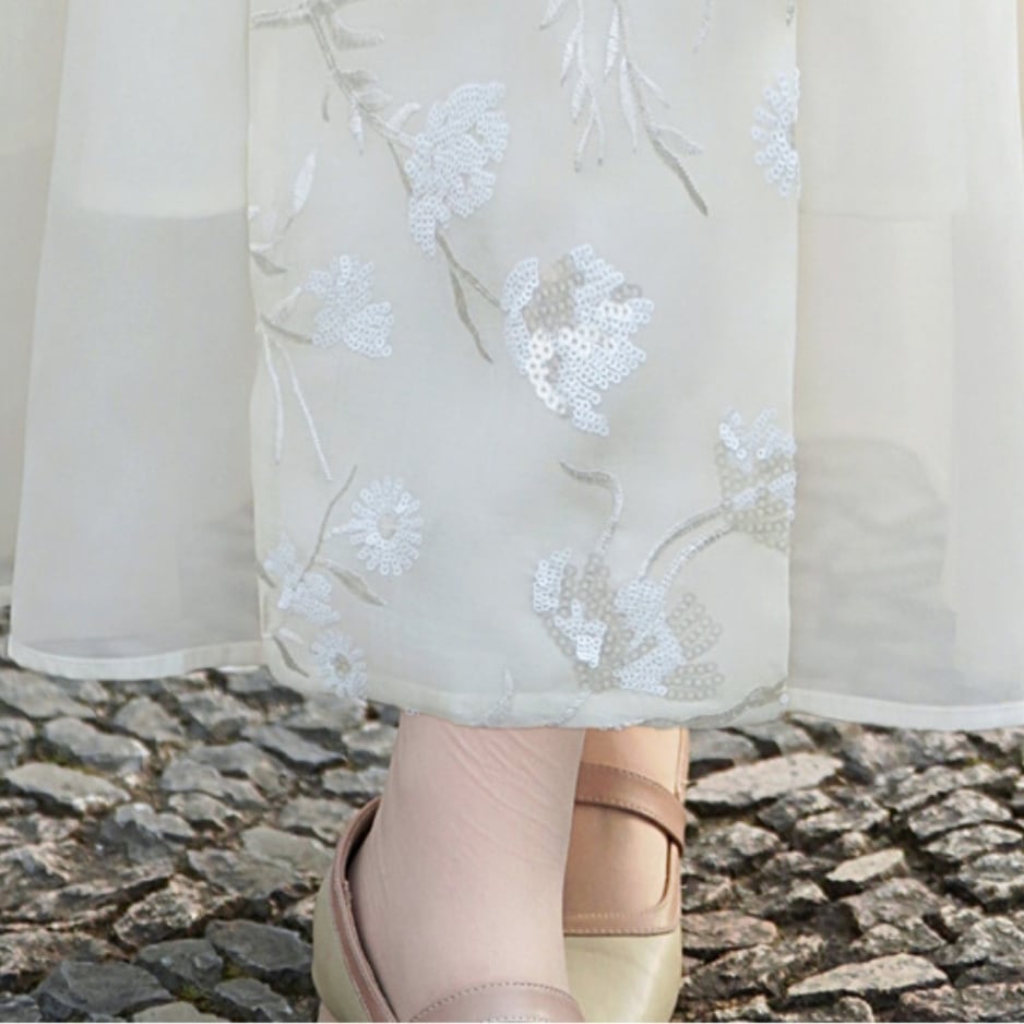 繊細な刺繍をあしらったトップスと、軽やかに広がるスカートを組み合わせた