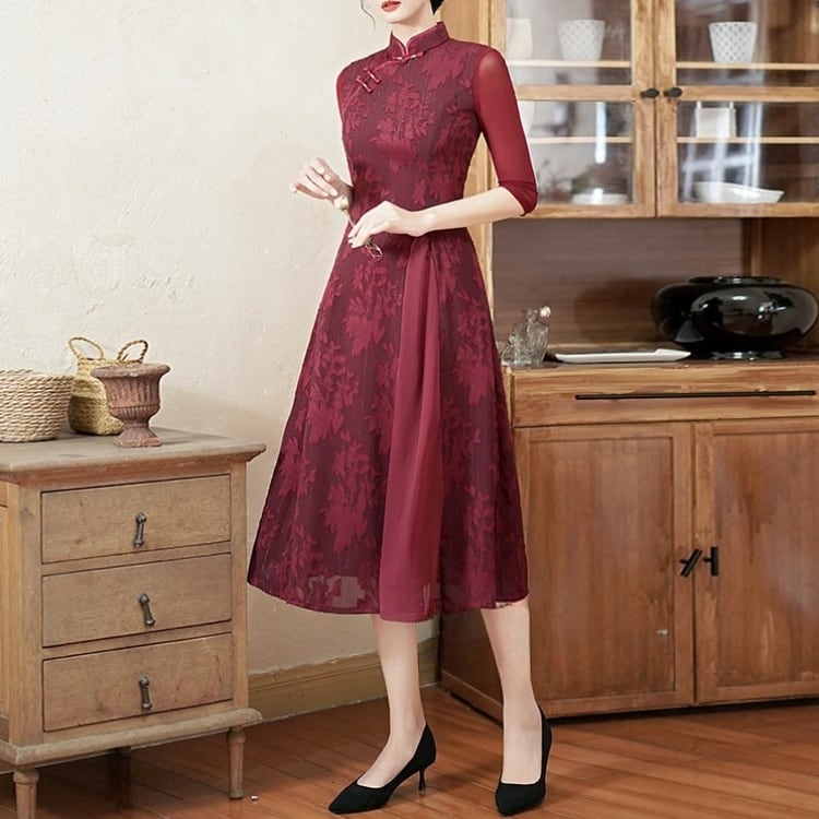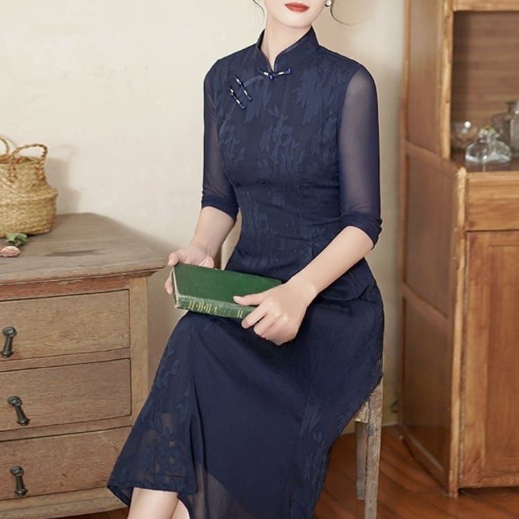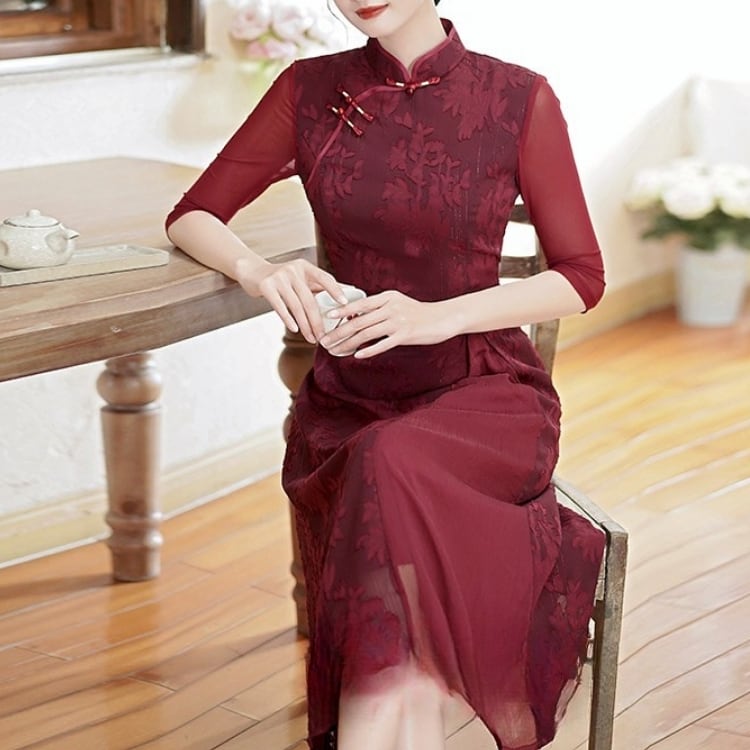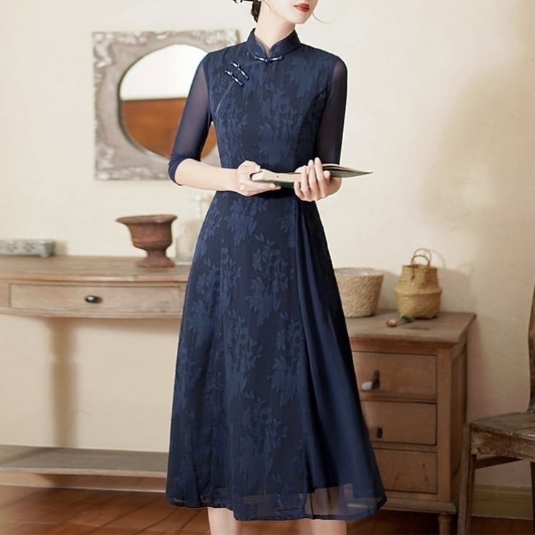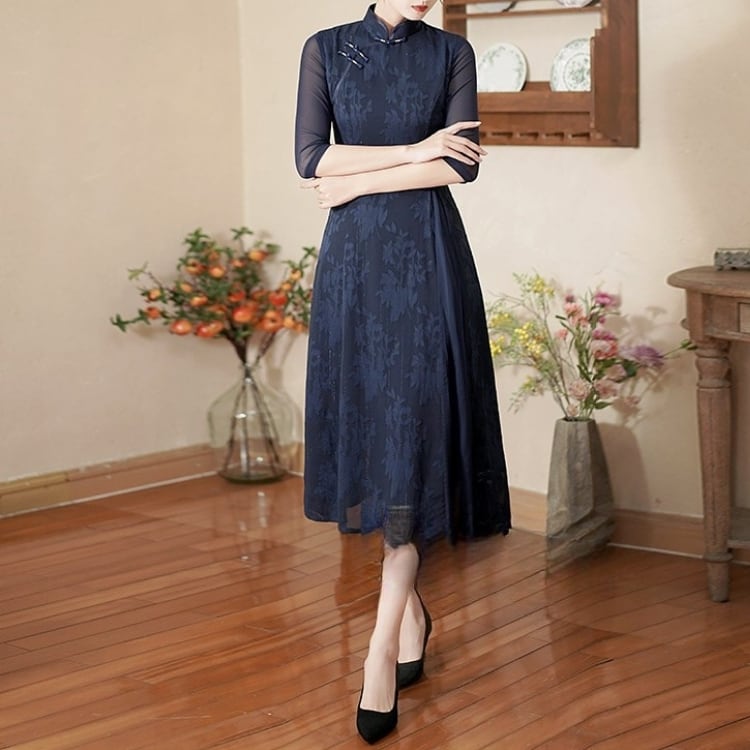 胸元にチャイナボタンを添えた、上品な印象のロングワンピース。