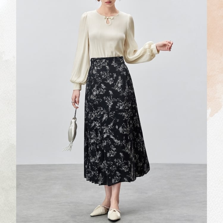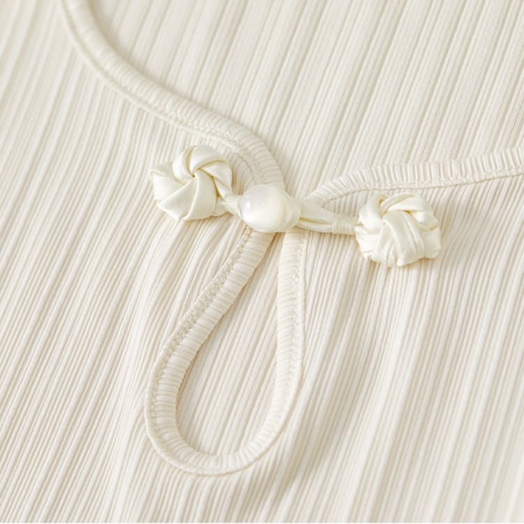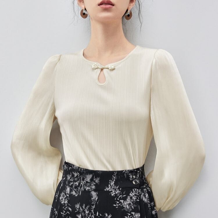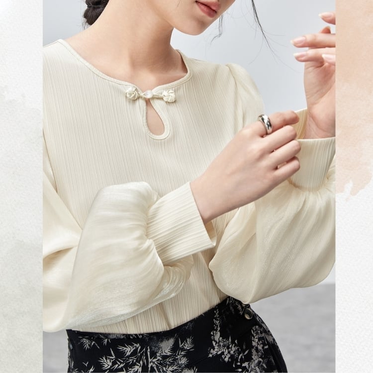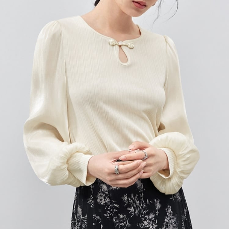 首元のチャイナボタンが上品なアクセントを添えてくれる長袖トップス。