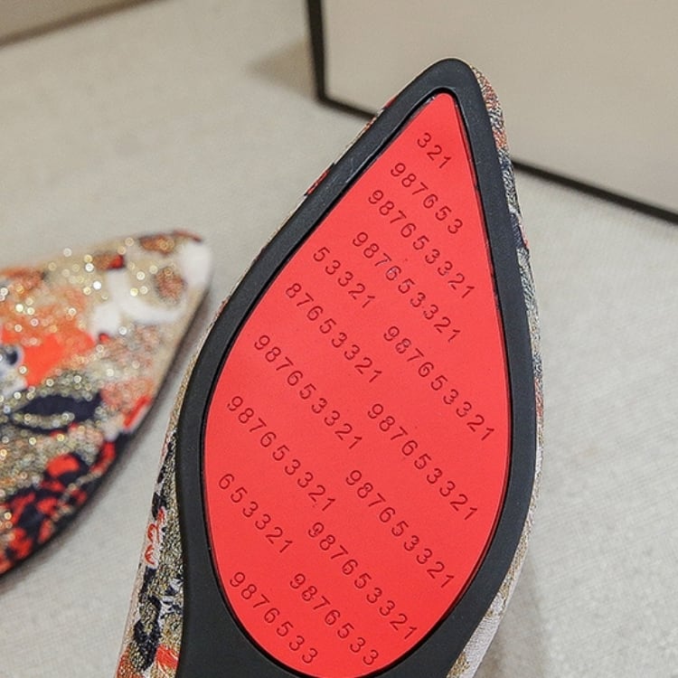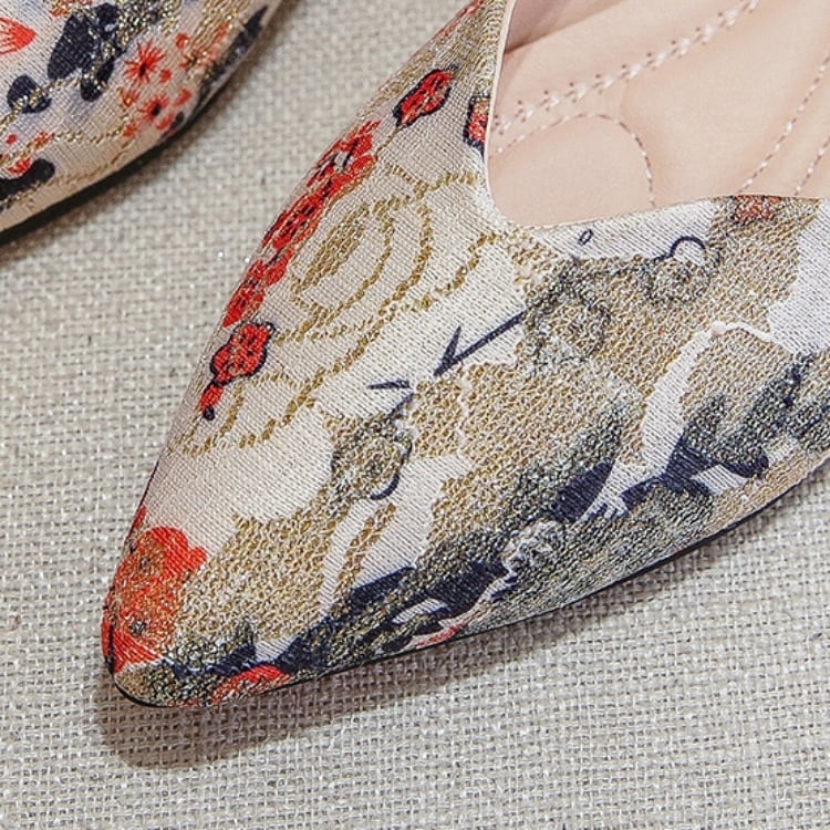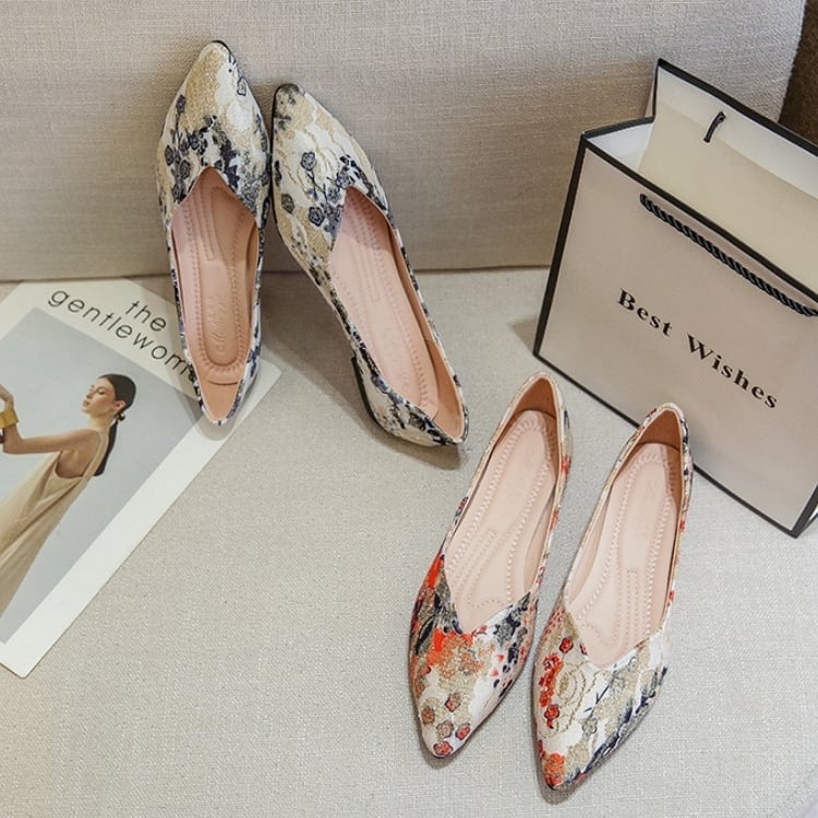 ジャカード生地を使用した、ポインテッドトゥのフラットシューズ。