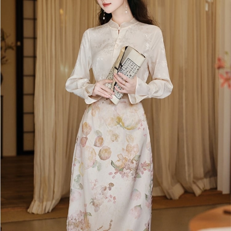 水彩画を思わせる柔らかな花模様をあしらったセットアップ。
