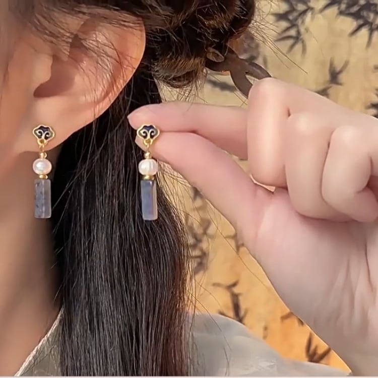 凛とした石の存在感が耳元を引き締め、繊細な彩色モチーフとパールが上品な華やぎを添えます。