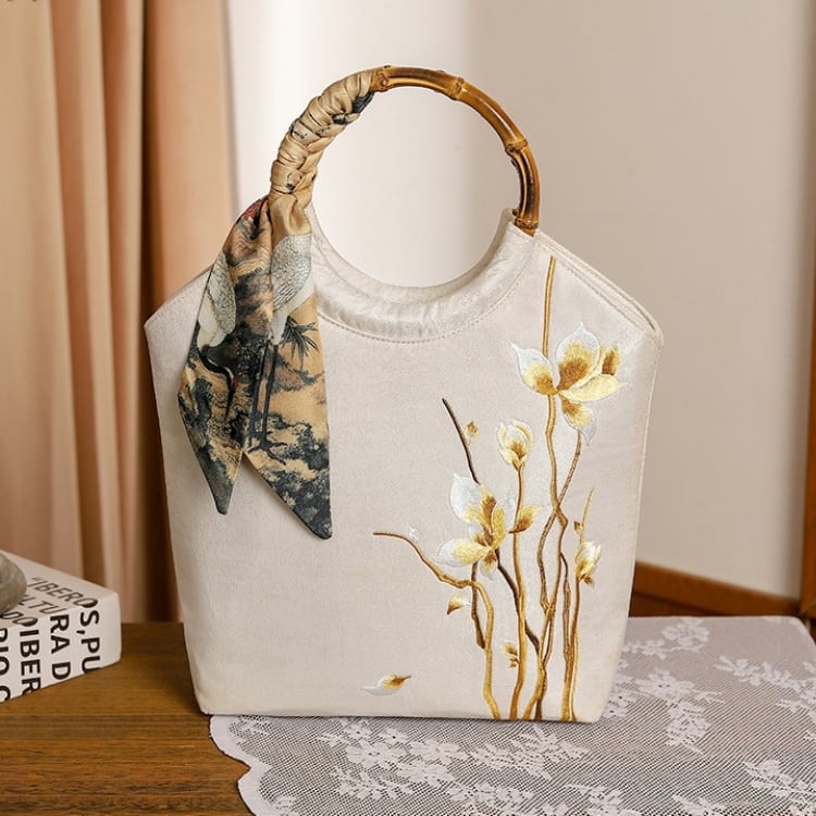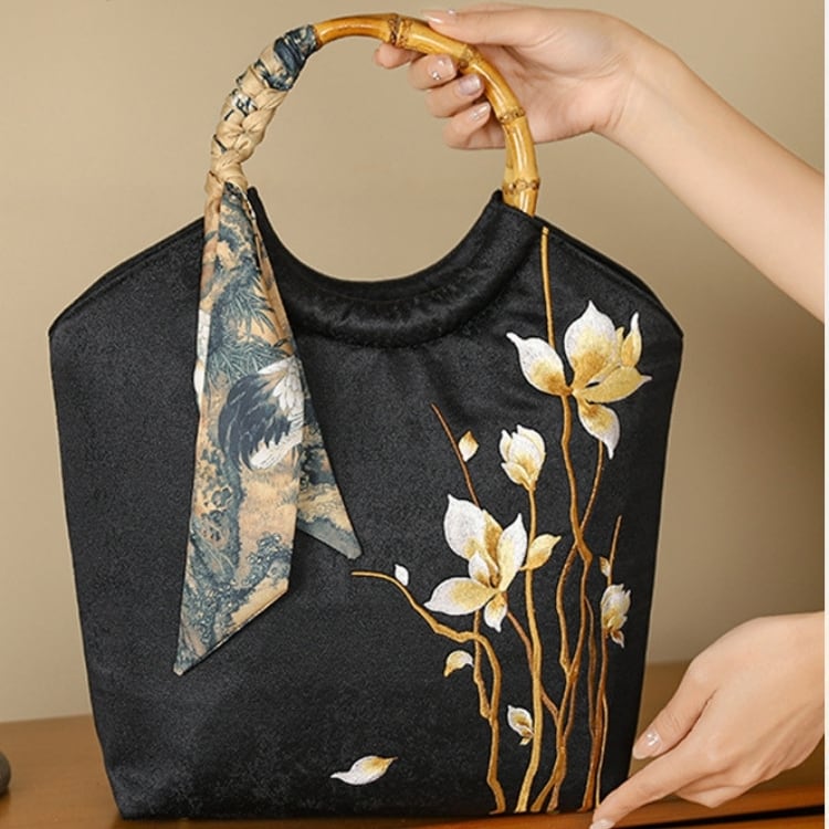 花刺繍が華やかに映える、竹製ハンドルのエレガントなバッグ。
