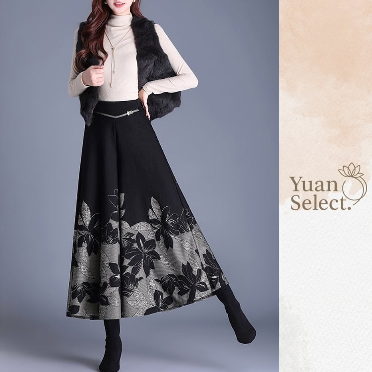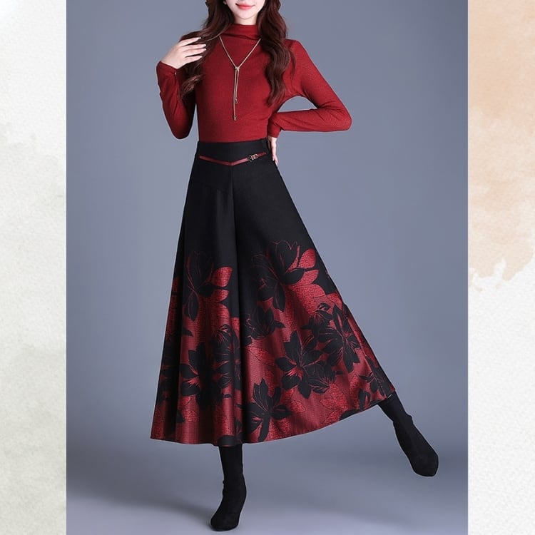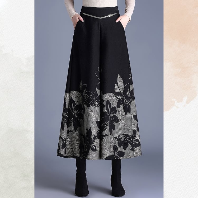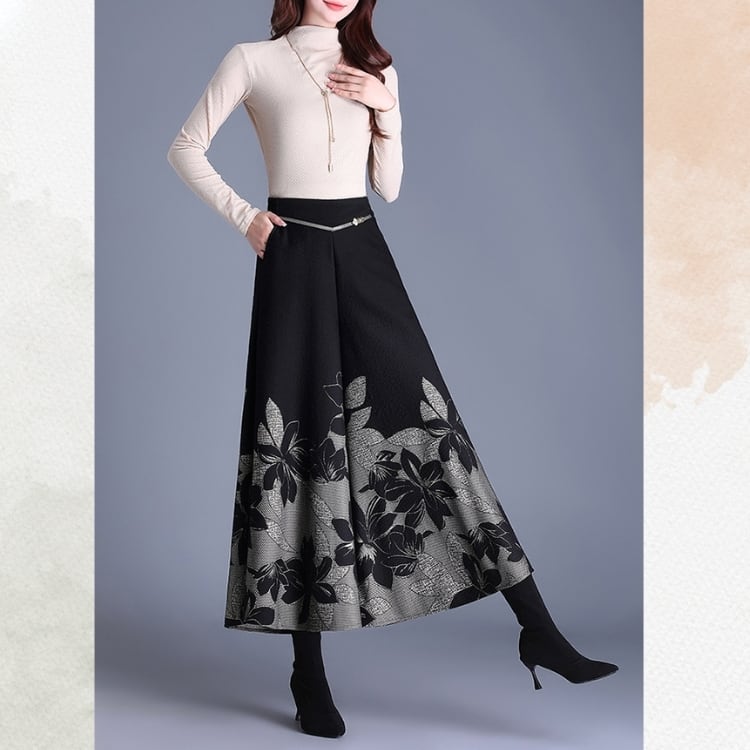 脚元に大ぶりの花模様をあしらい、歩くたびに華やかさが漂うワイドパンツ。