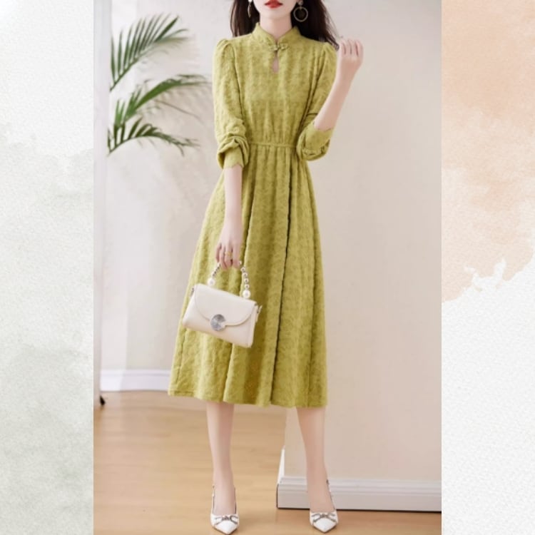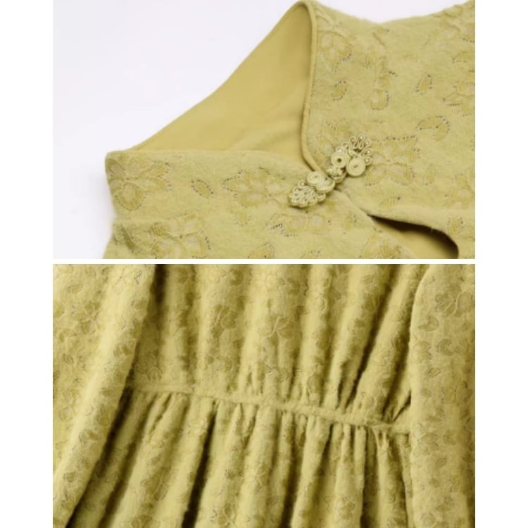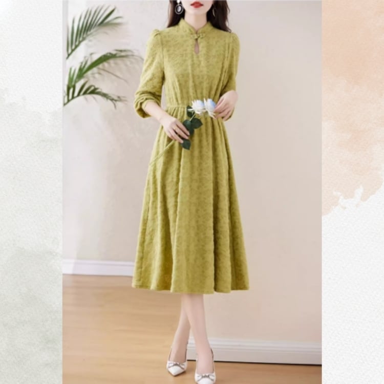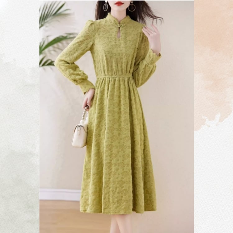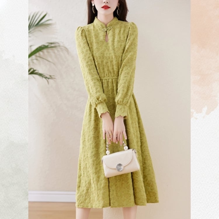 繊細なジャカード生地に、クラシカルなチャイナボタンを添えたロングワンピース。