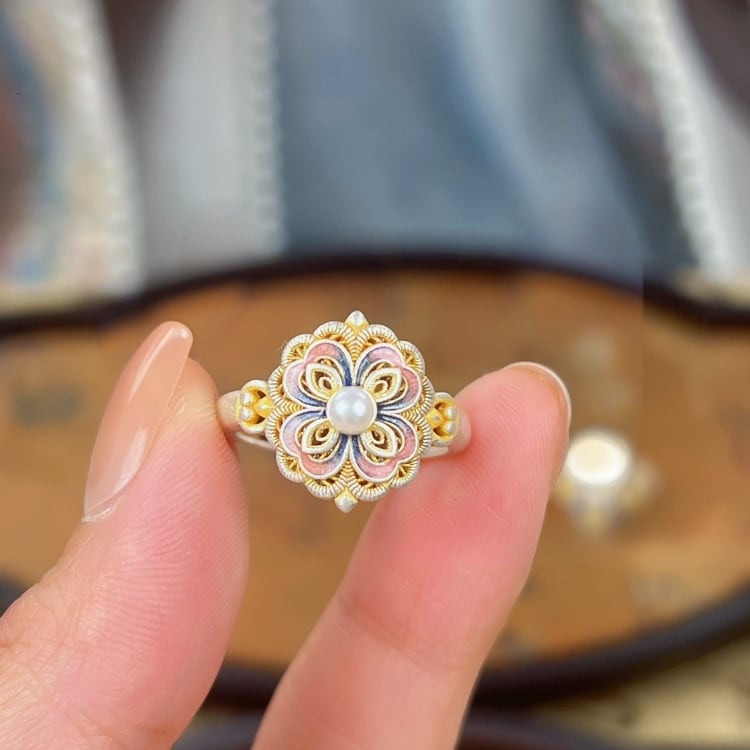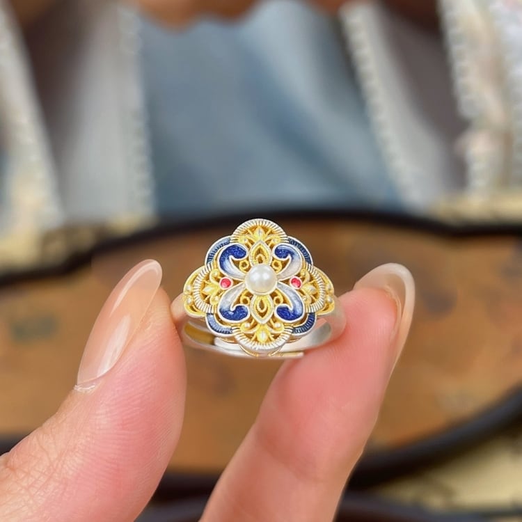 中国伝統の意匠を思わせる花模様と彩り豊かな仕上げが印象的なシルバー999のリング。
