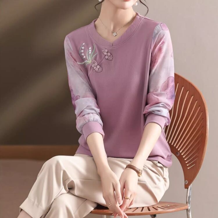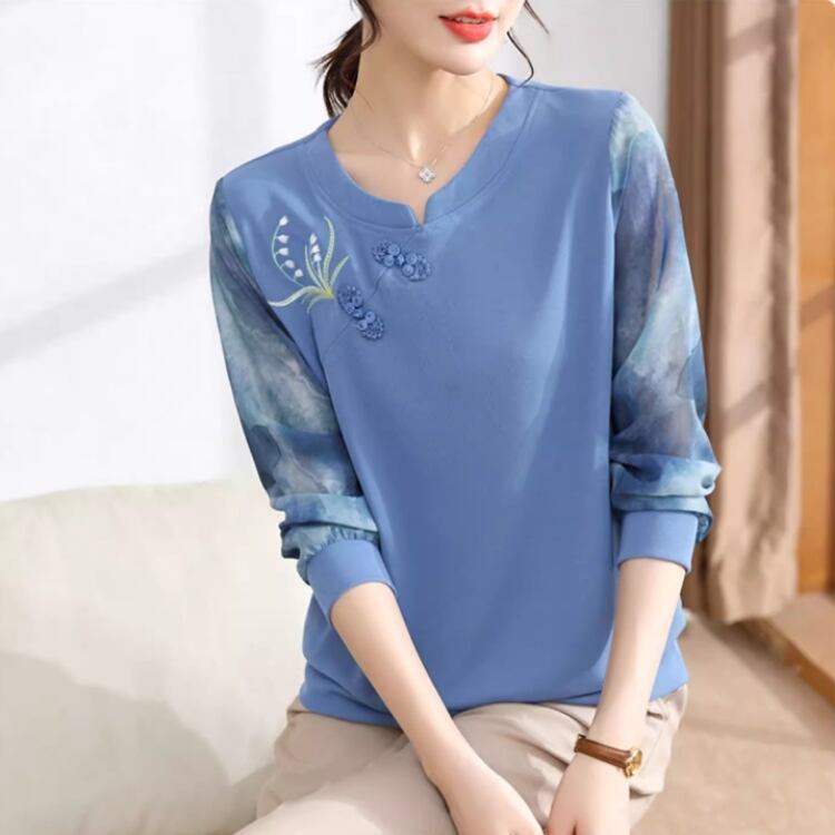 柔らかな生地感に、胸元の花刺繍とチャイナディテールを添えた上品なトップス。