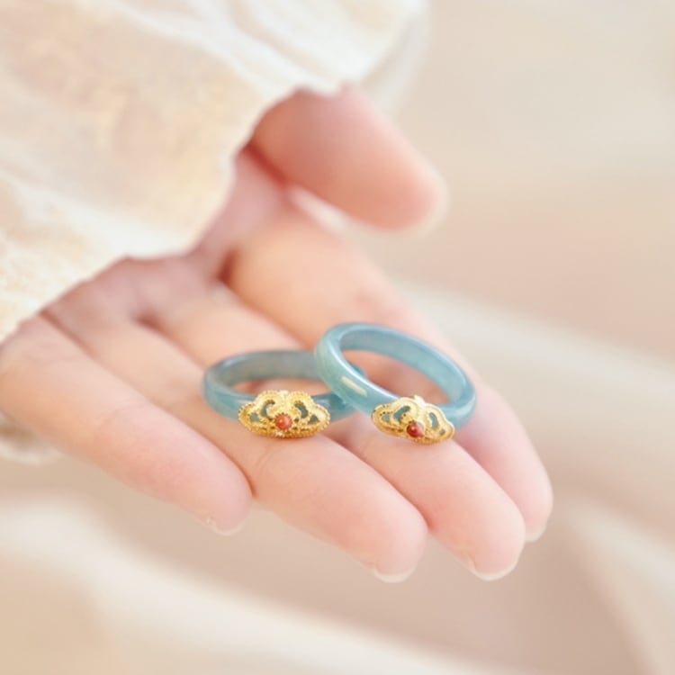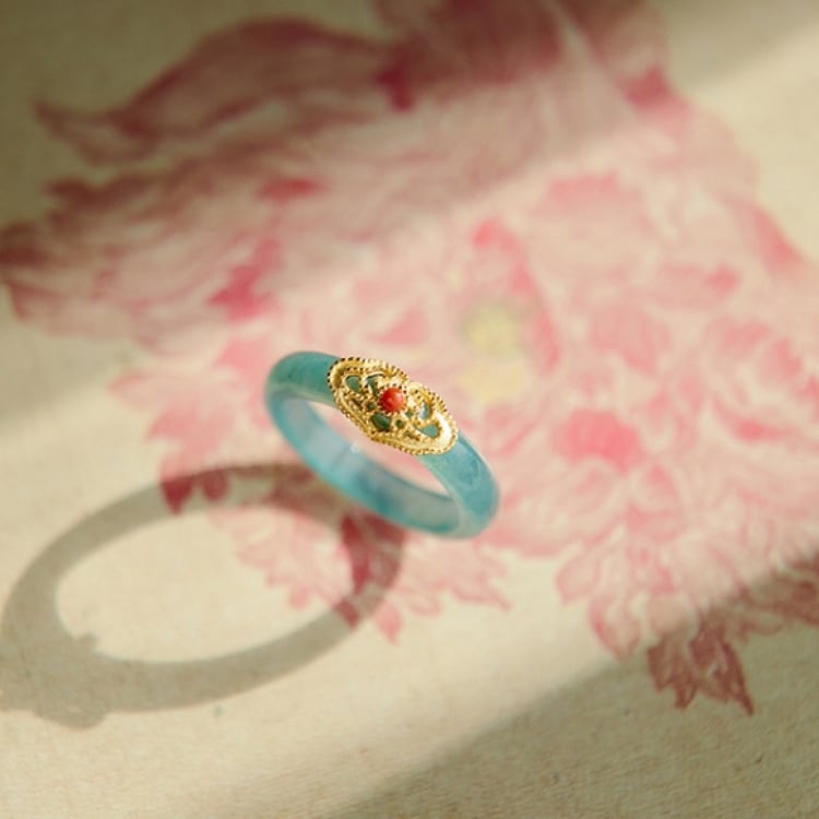 透明感のある翡翠に、繊細な金細工をあしらったチャイナモチーフリング。