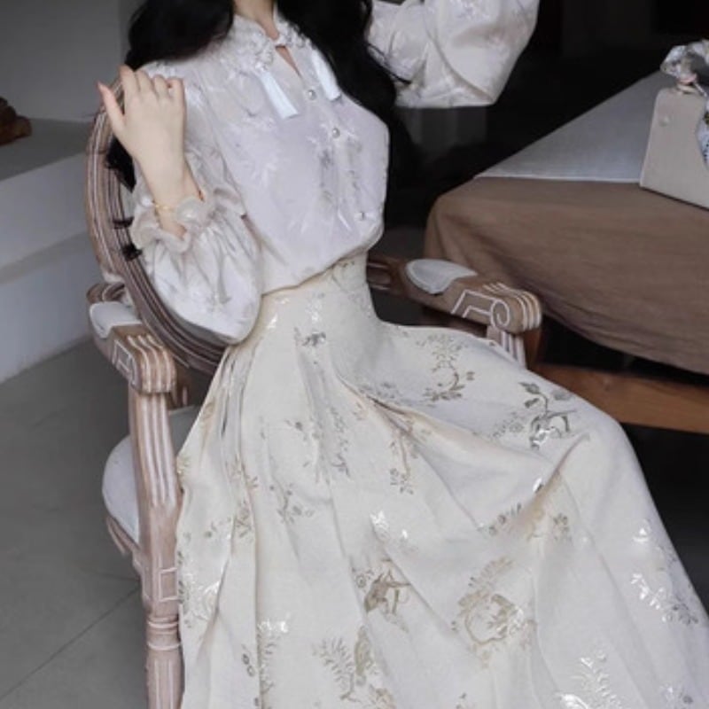 上品な光沢を纏ったトップスと、金糸刺繍が映えるジャカードスカートを組み合わせたセットアップ。