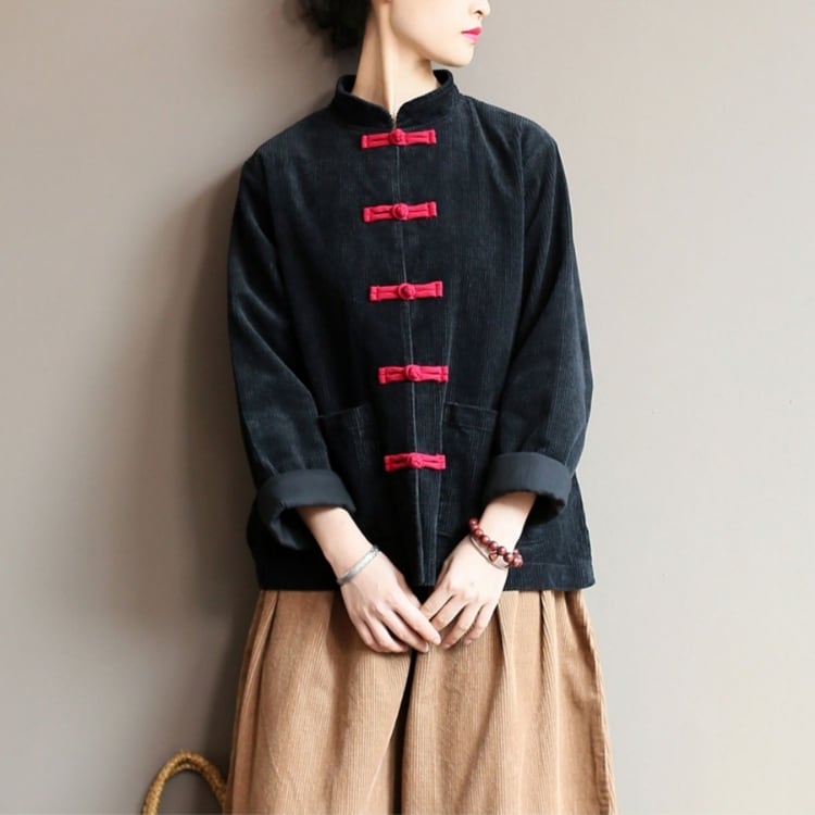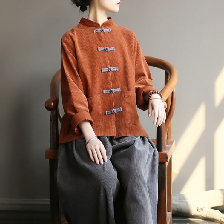 温かみのあるコーデュロイ素材に、チャイナボタンをあしらったナチュラルなジャケット。