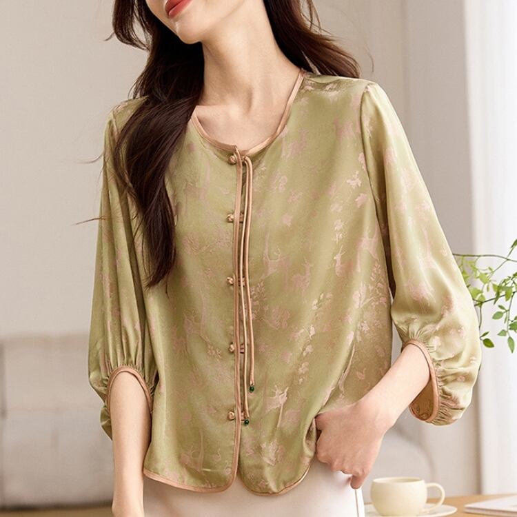 小鹿モチーフジャカード ノーカラーブラウス YS00105