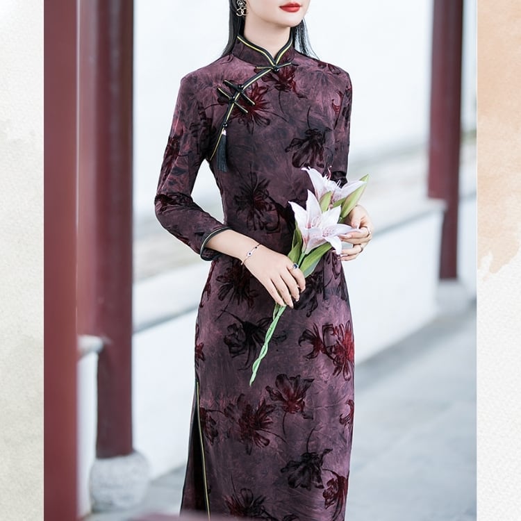 深みのある色合いに花模様を織り込んだ、クラシカルなロングチャイナワンピース。