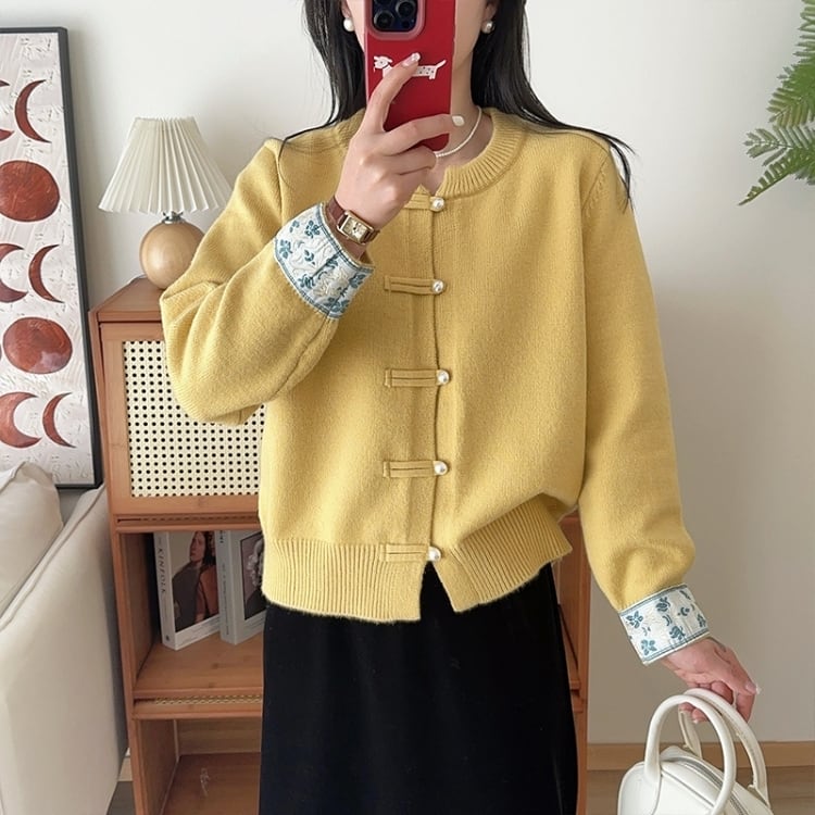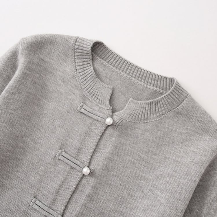 パール調のチャイナボタンが上品なアクセントになったカーディガン。