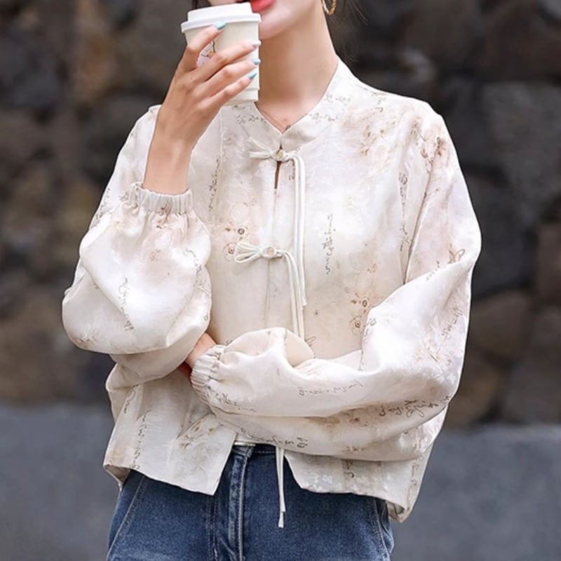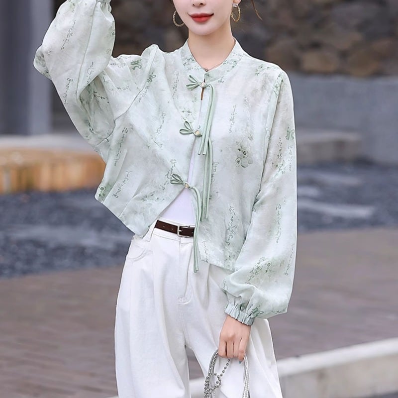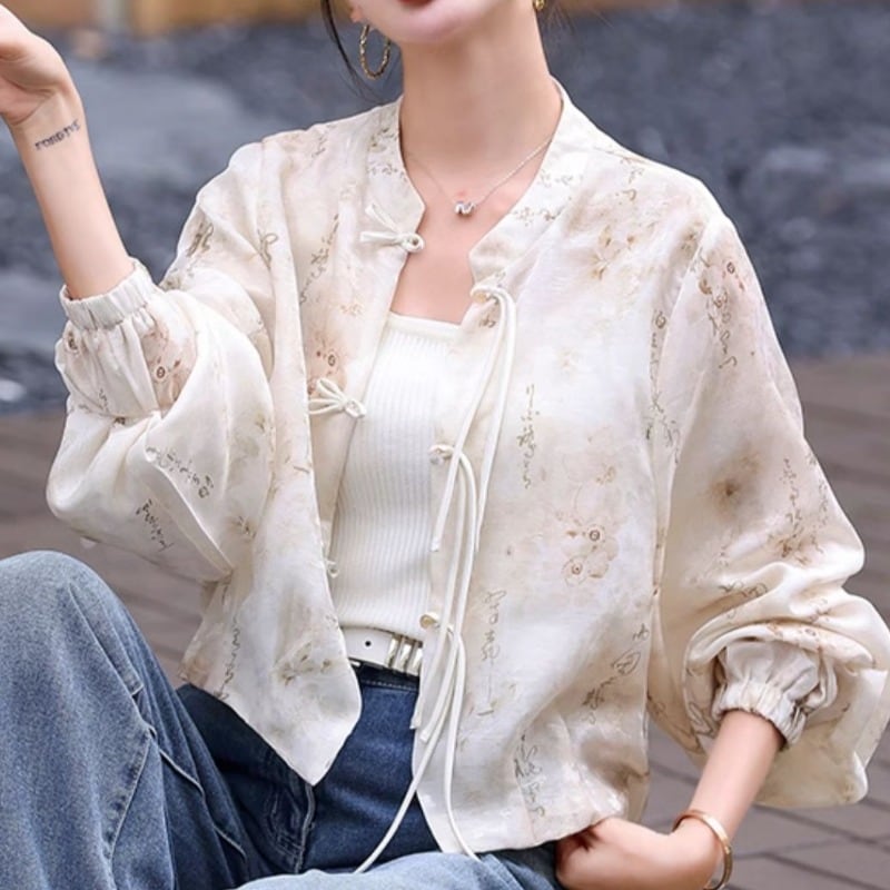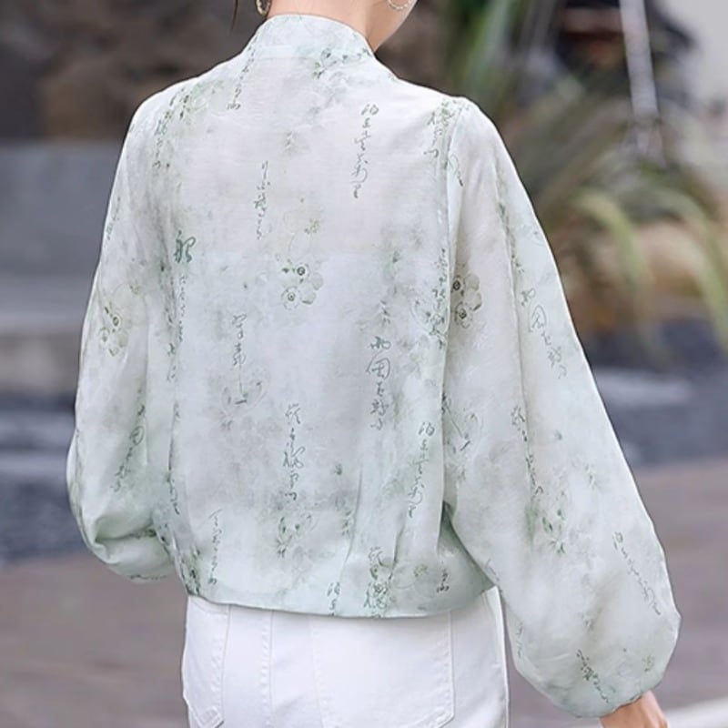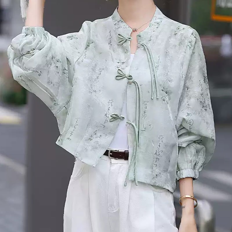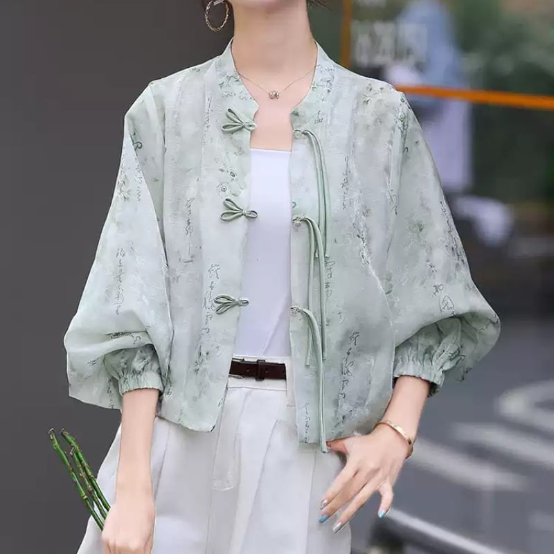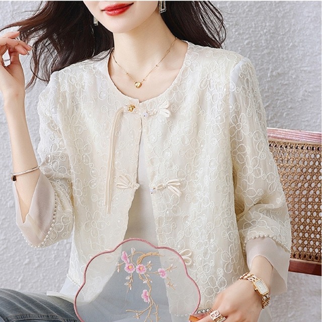 ふんわりとしたシアー素材にチャイナボタンをあしらったジャケット。