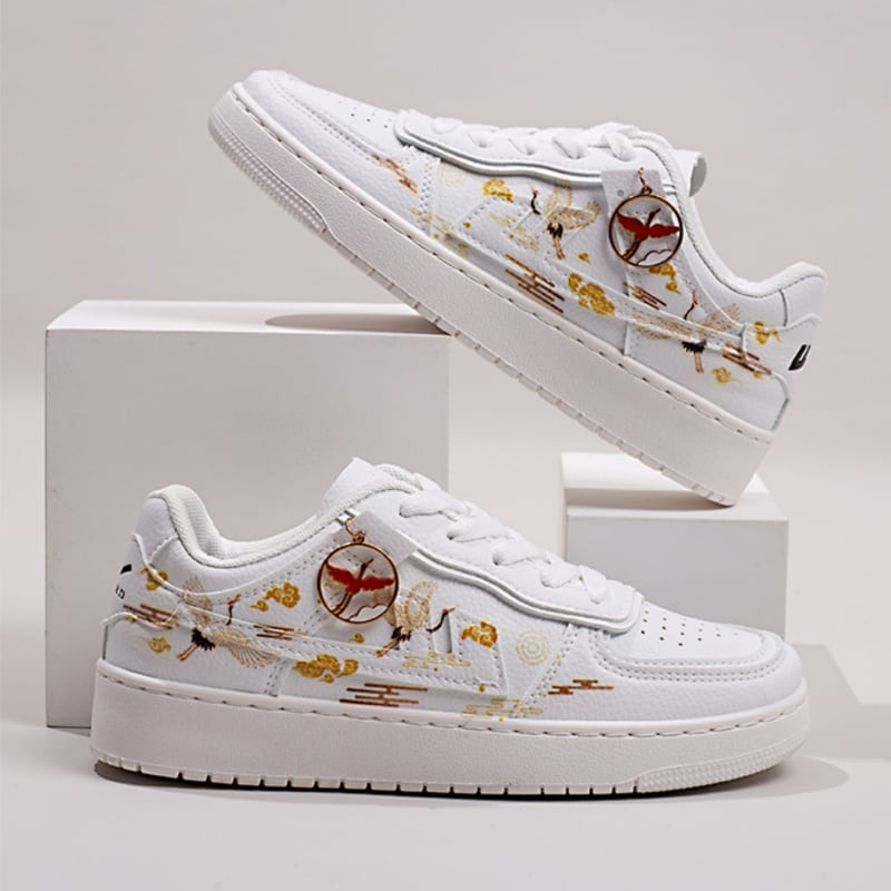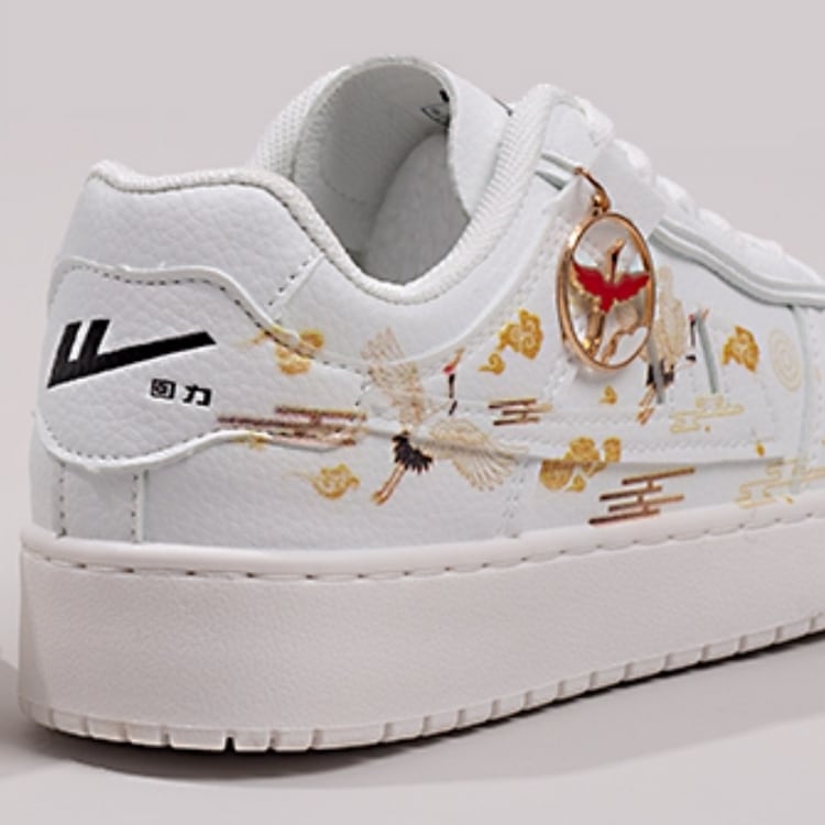 伝統的な鶴と雲のモチーフをあしらった、モダンチャイナデザインのスニーカー。