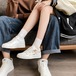 白を基調としたデザインは、どんなスタイルにも合わせやすく、足元に軽やかな華やぎを添えます。