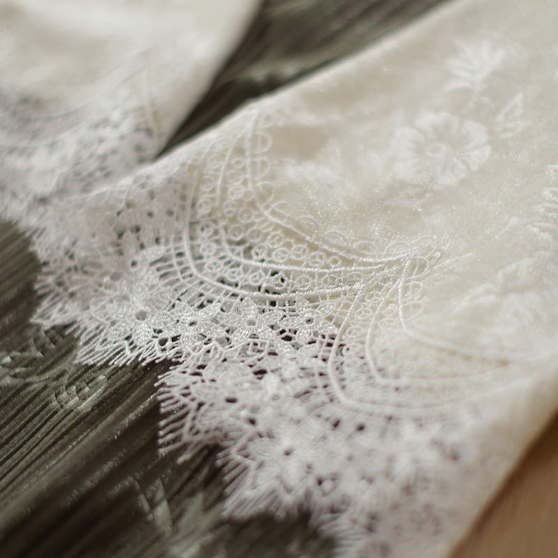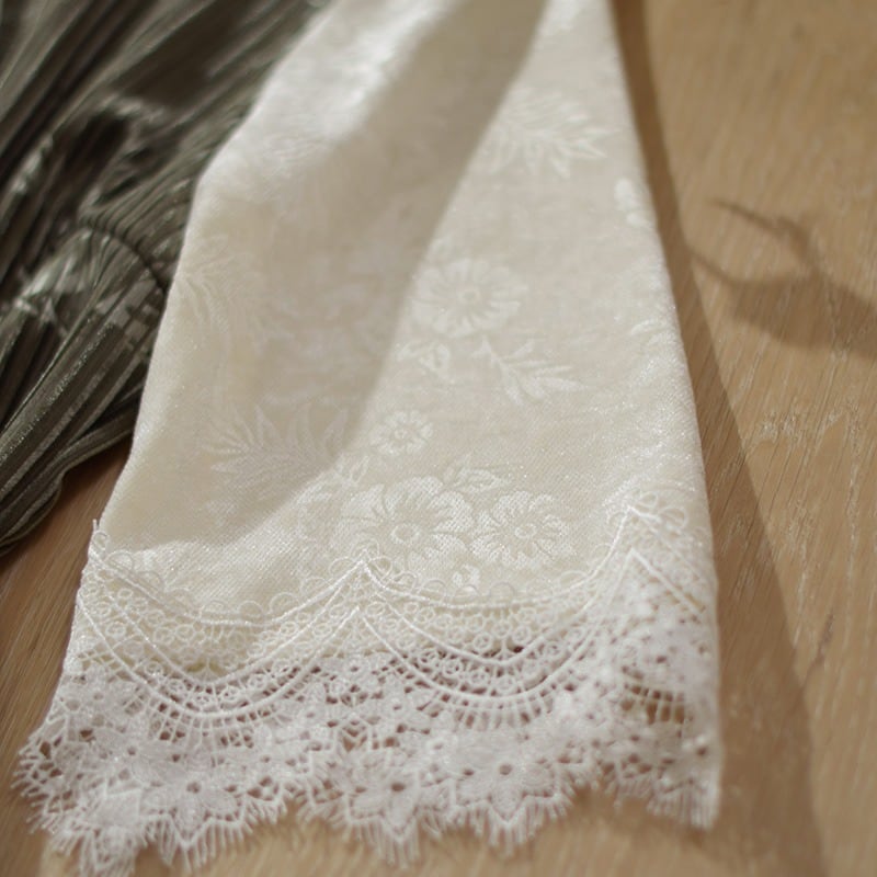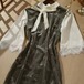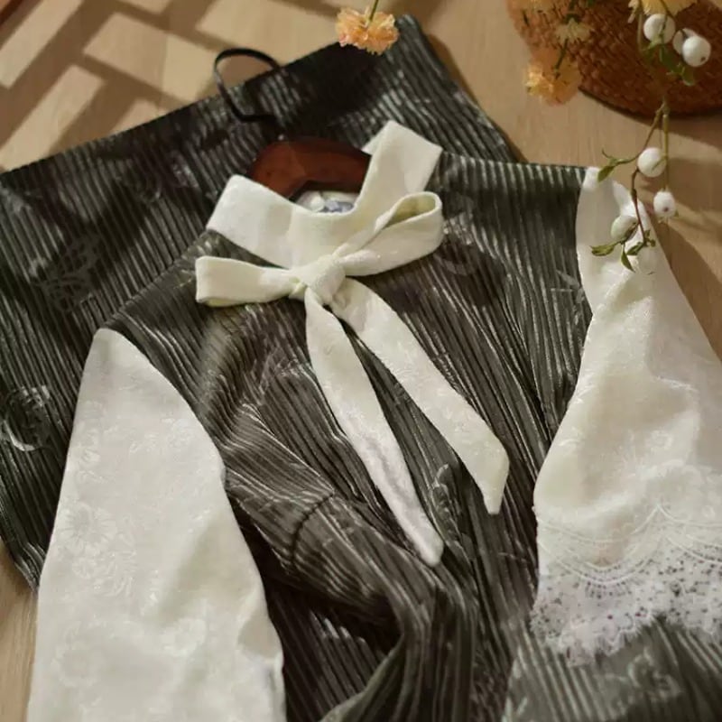 胸元のリボン結びが品良く映え、レース袖が優雅な雰囲気を添えます。