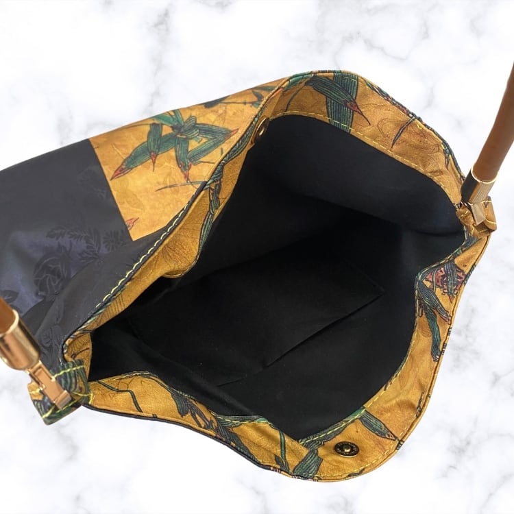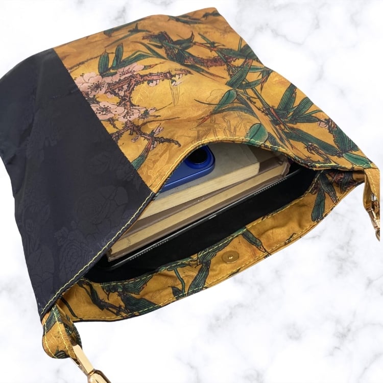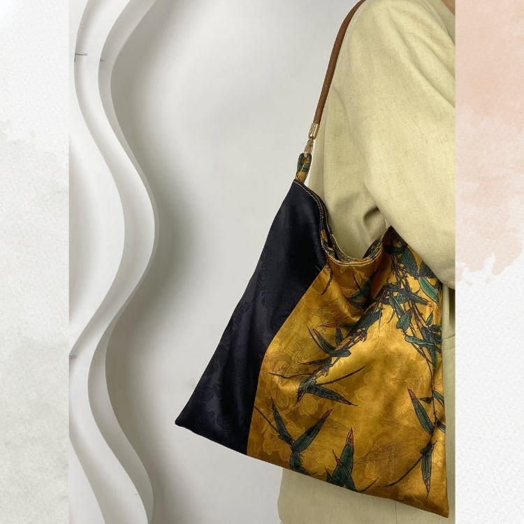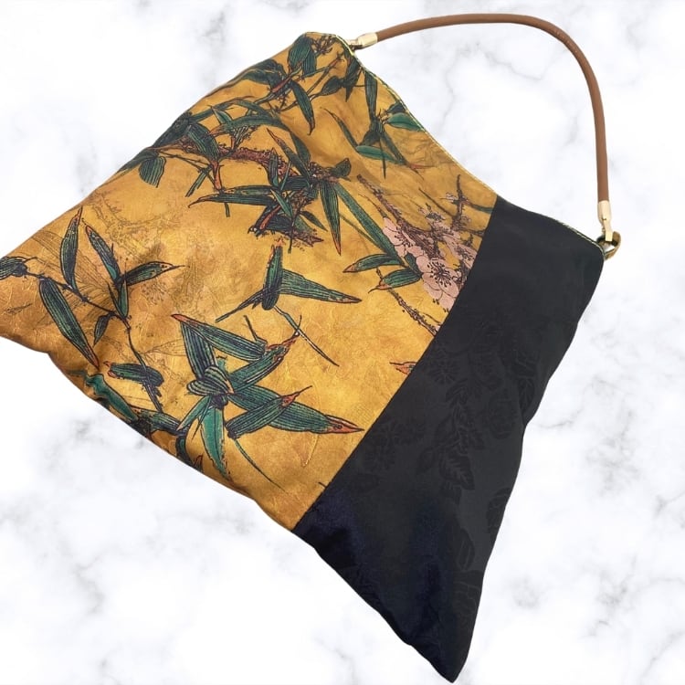 黒と金のコントラストが印象的な、竹文様のシルクショルダーバッグ。