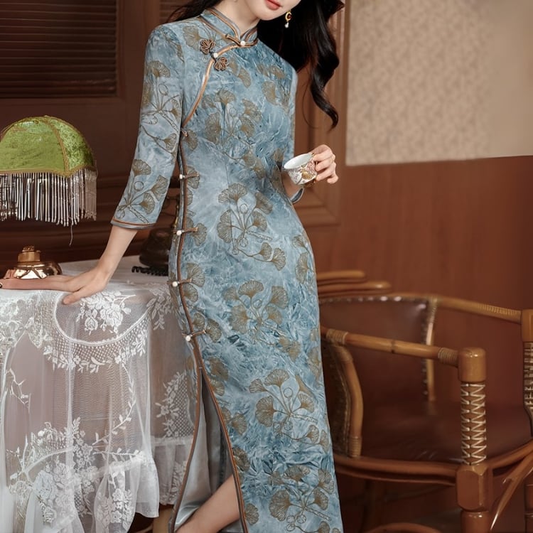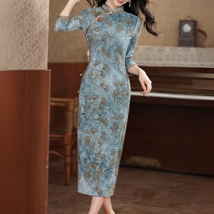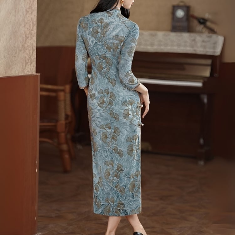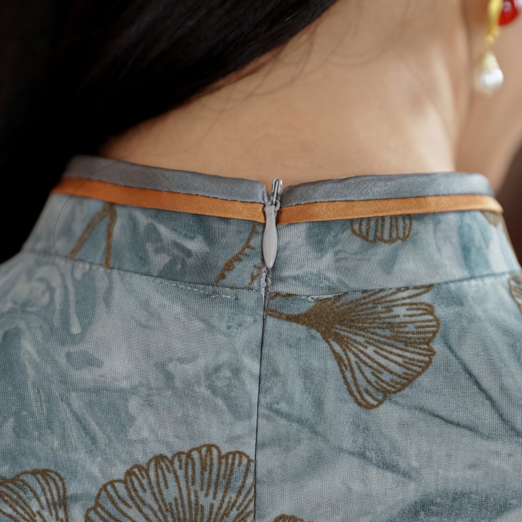 水彩画のようなニュアンスのある色合いで、銀杏柄が全体に描かれた旗袍(チャイナドレス)。