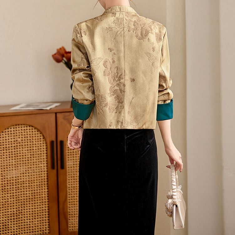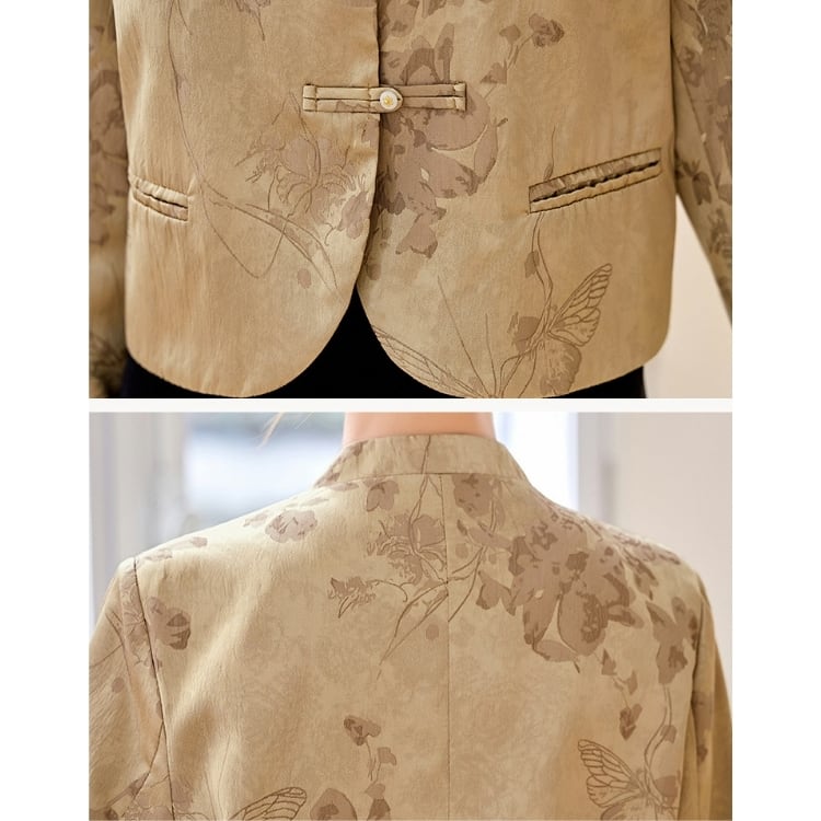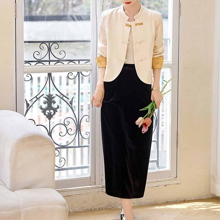 ジャカード織の生地にチャイナボタンを配した、ジャケットとスカートのセットアップ。