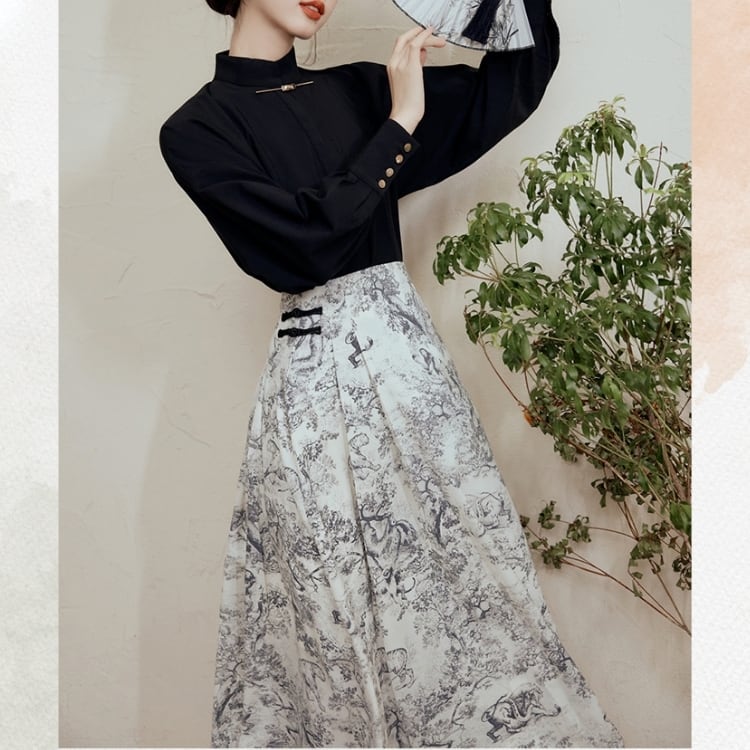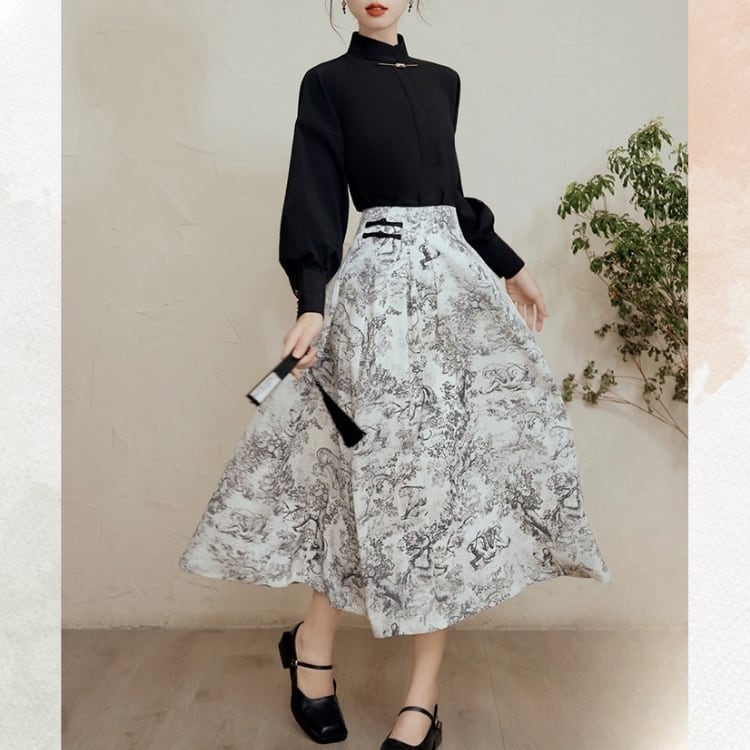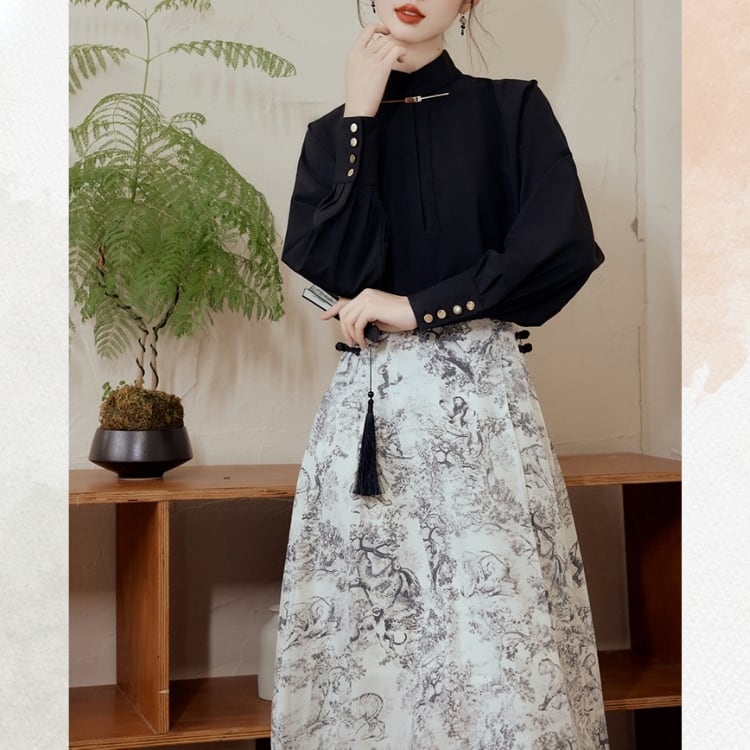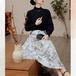 金具デザインブラウス×水墨画風スカートセットアップ YS00174