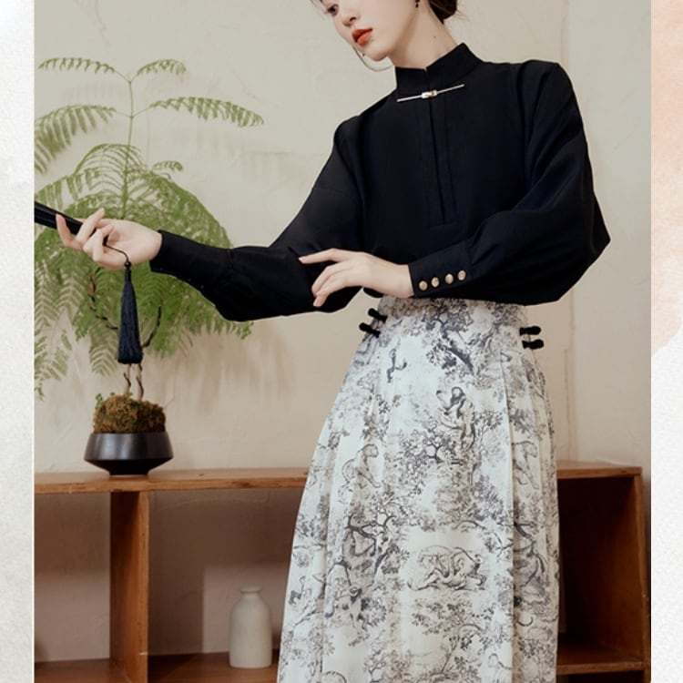 襟元と袖口の金具パーツが印象的なブラウスと、水墨画風のプリントスカートを合わせた上品なセットアップ。