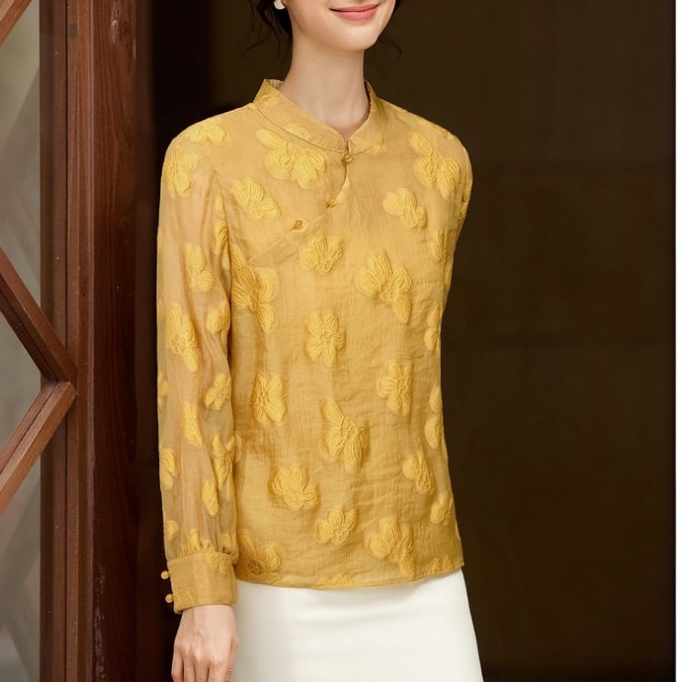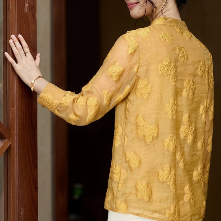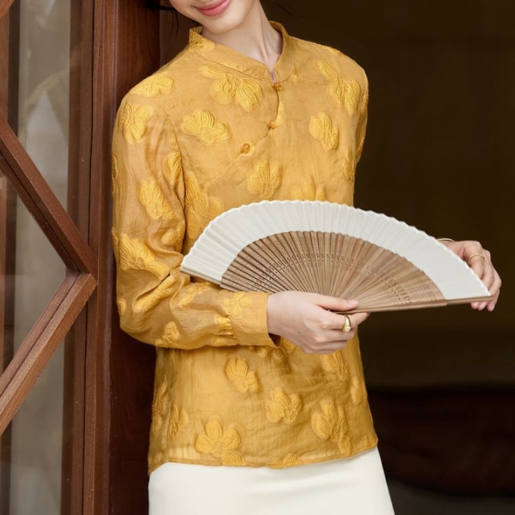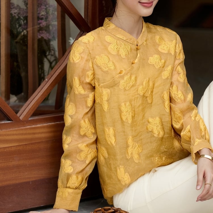 繊細な花文様をあしらった、軽やかな透け感のあるチャイナブラウス。