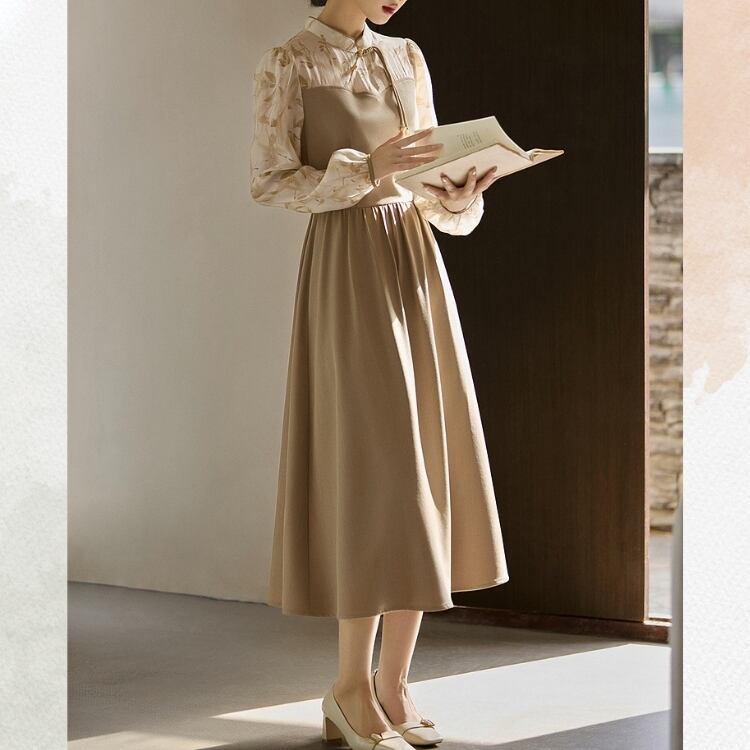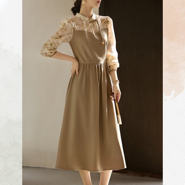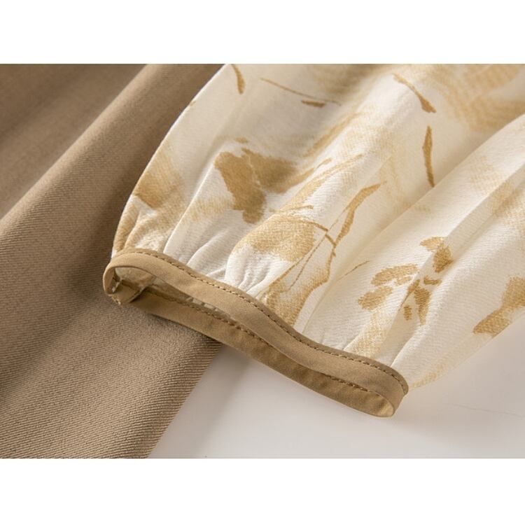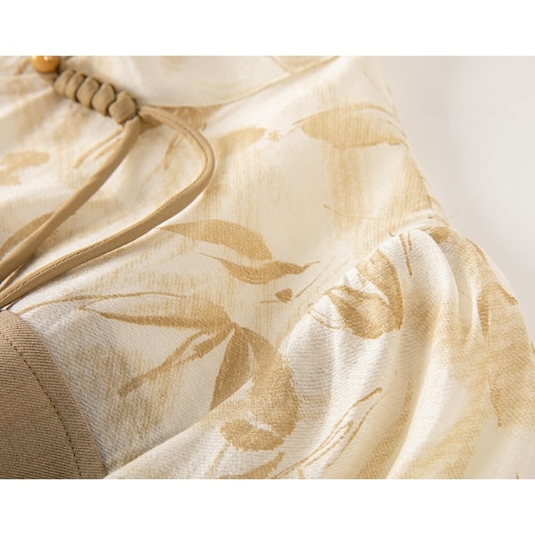 ナチュラル竹葉柄 シフォン切り替えワンピース YS00114
