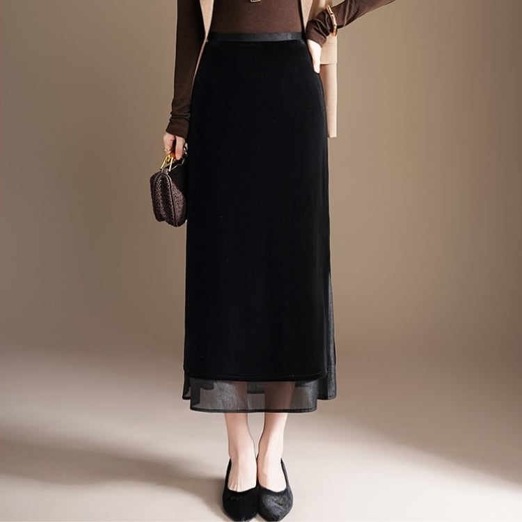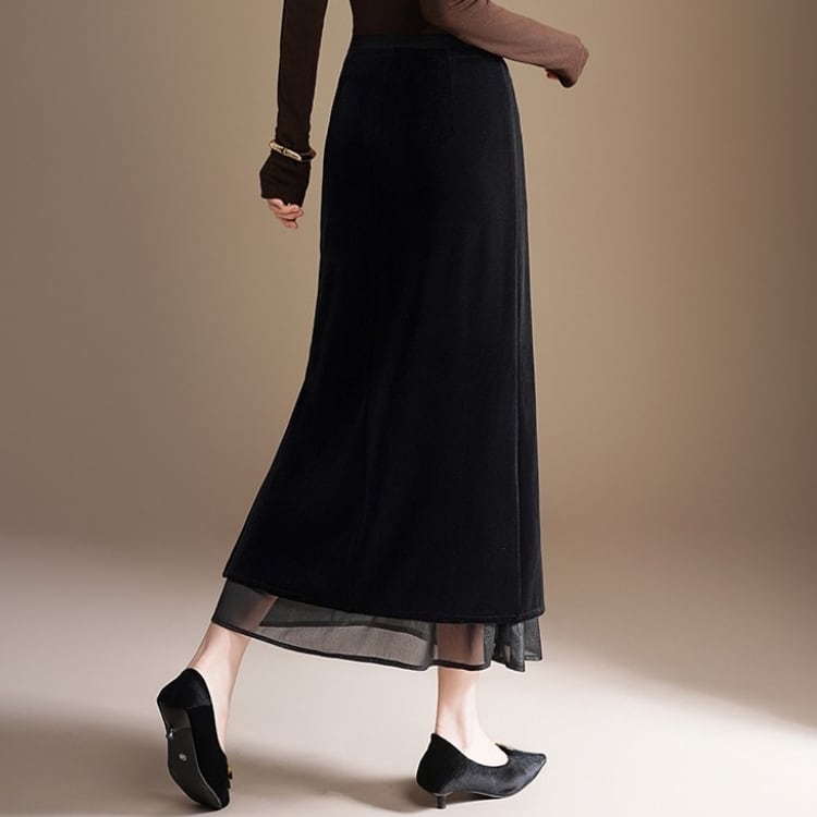 シンプルなブラックスカートに、裾から透け感のあるシフォンを重ねたデザイン。