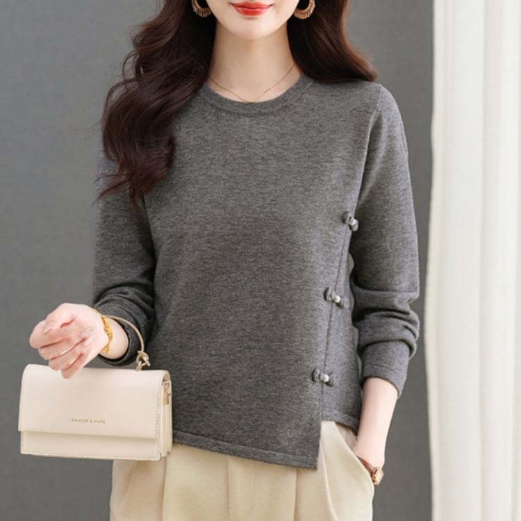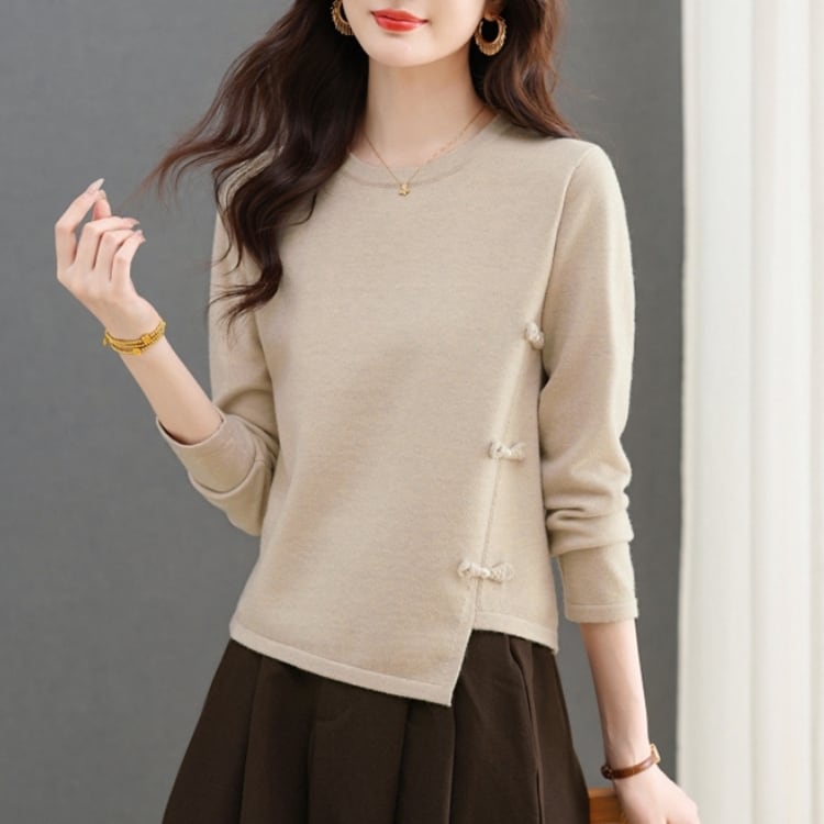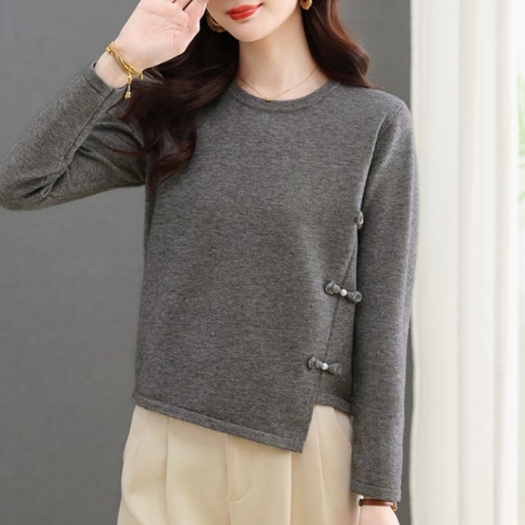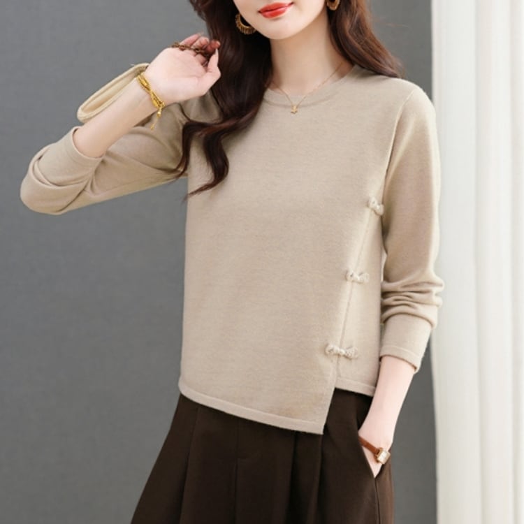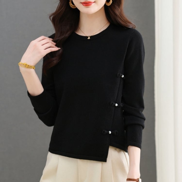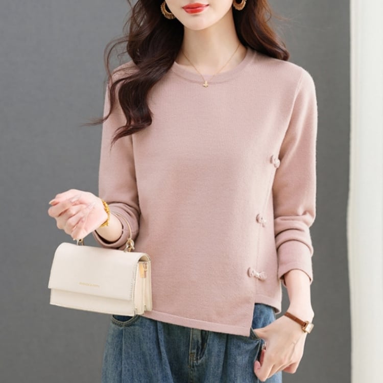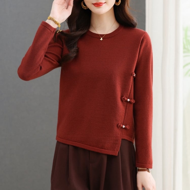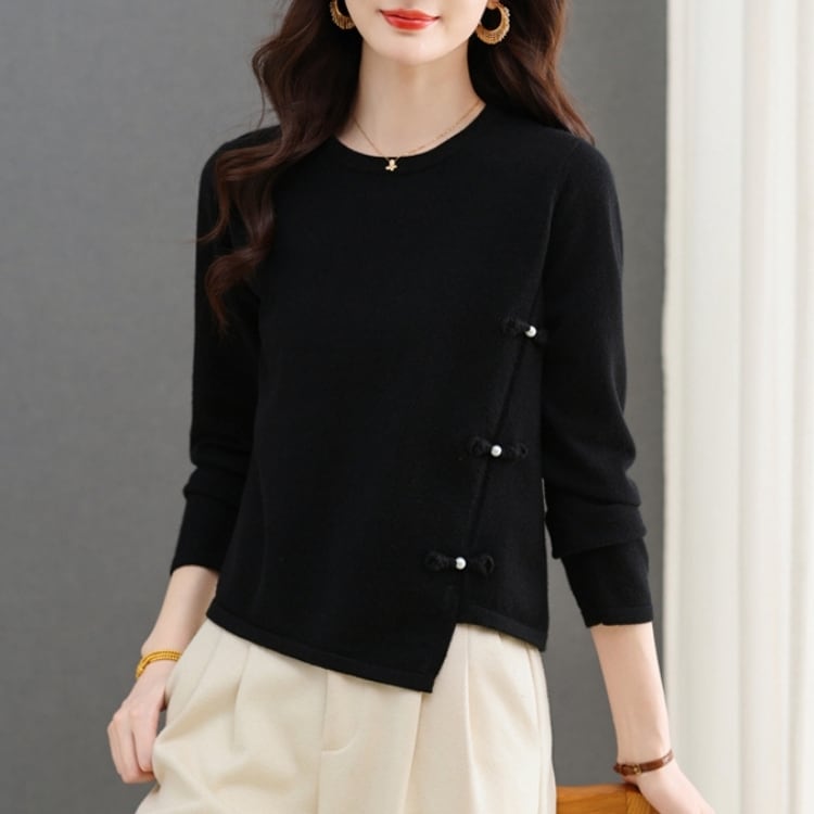 サイドに並んだチャイナボタンが印象的なニットプルオーバー。