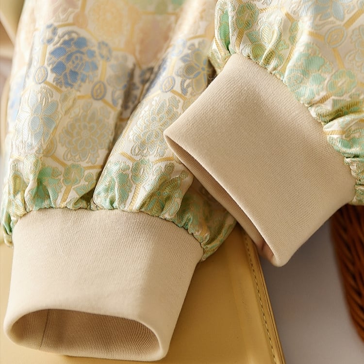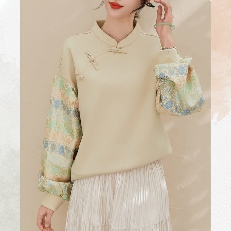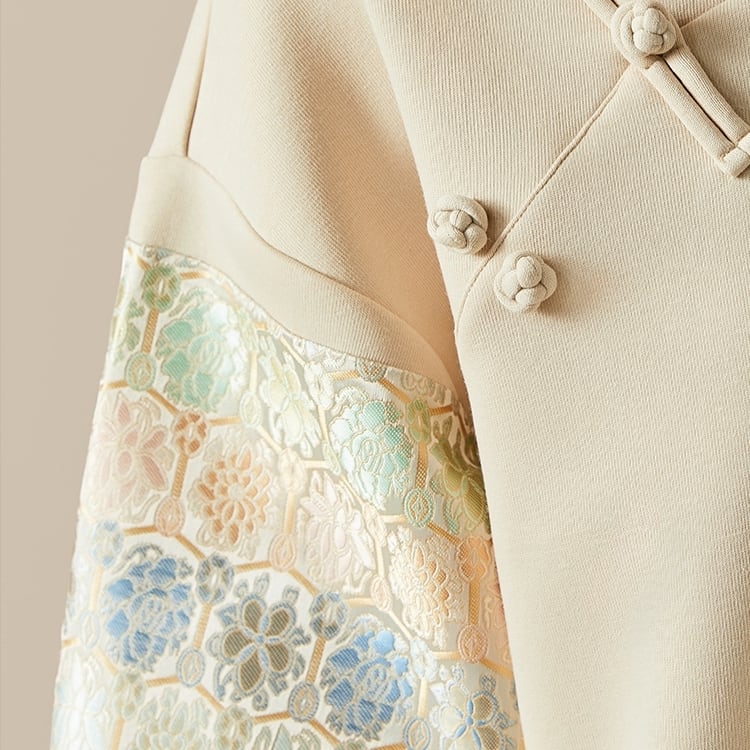 ゆったりとしたシルエットに、チャイナボタンと花文様ジャカード袖を組み合わせた一枚。