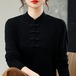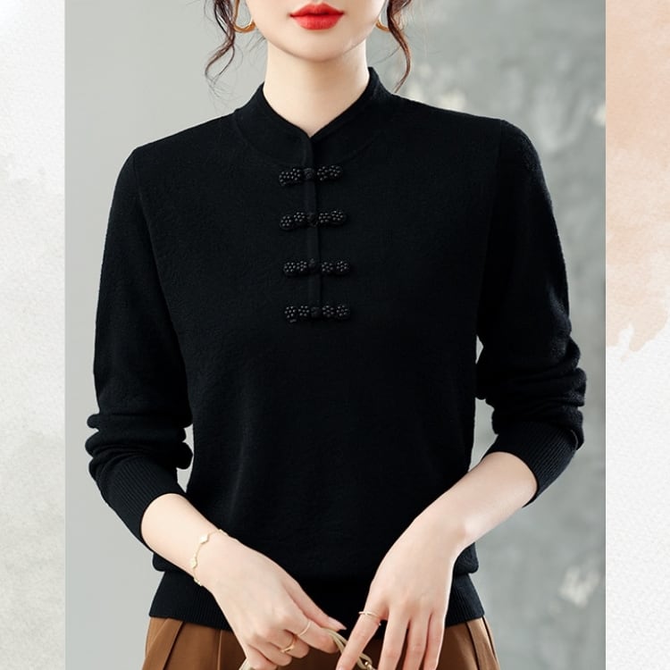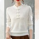 パール風のチャイナボタンが胸元に並ぶ、上品な印象のニットトップス。