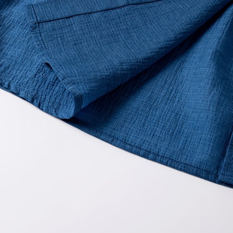 スタンドカラーと並んだチャイナボタンが、控えめに中華のニュアンスを漂わせます。