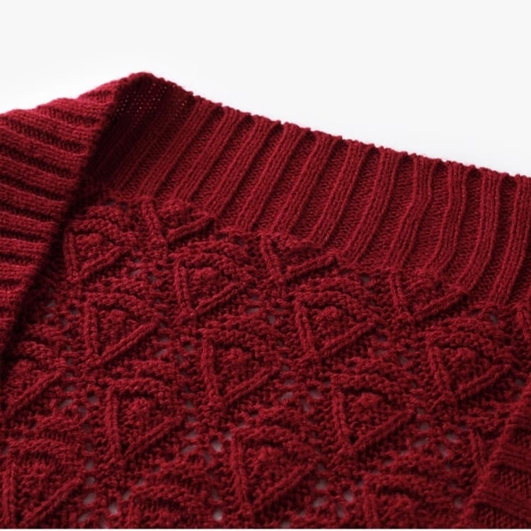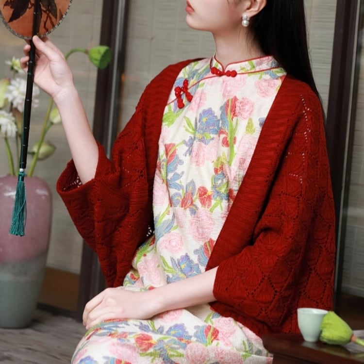 透かし編み模様が柔らかな印象を添えるチャイナ羽織カーディガン。