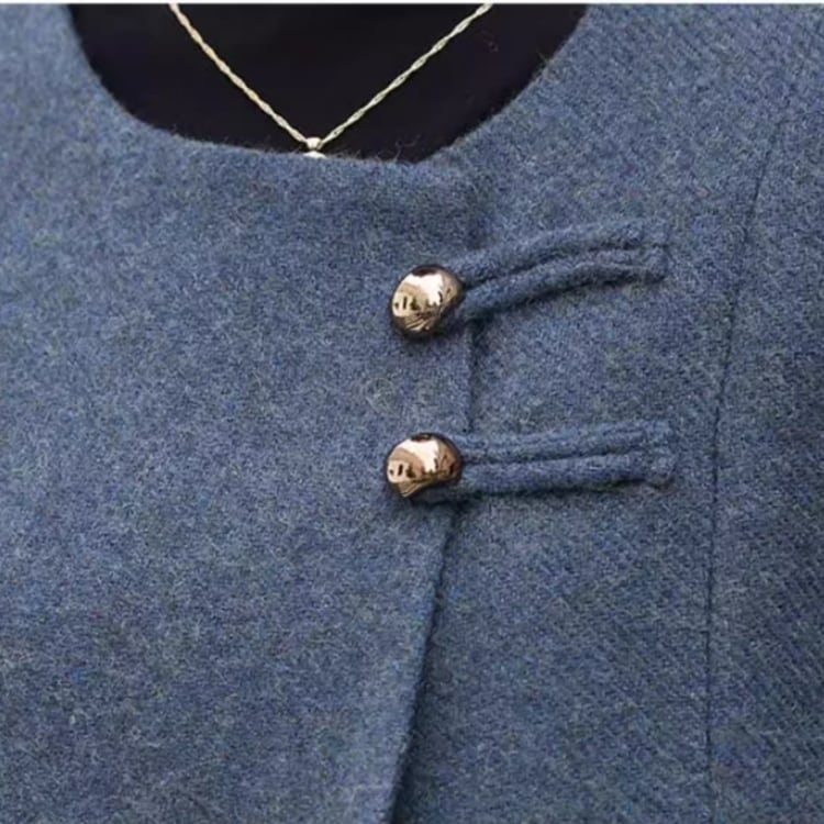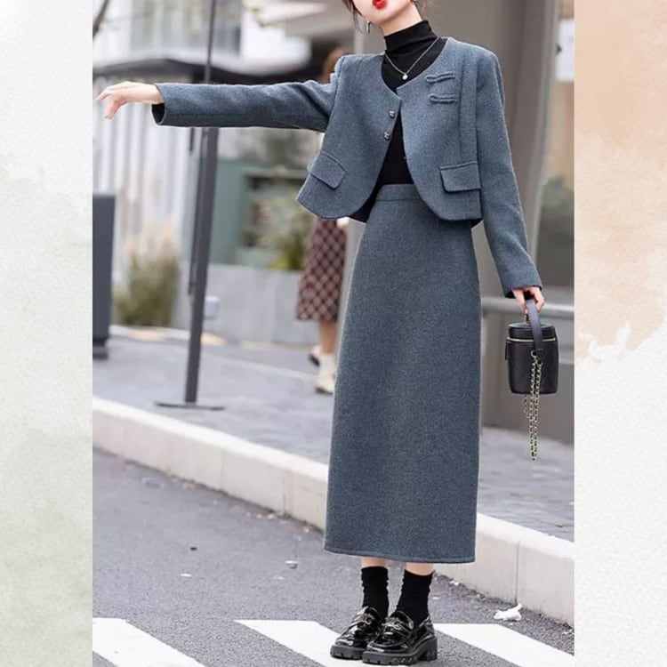 チャイナボタンを添えたノーカラージャケットと、すっきりとしたタイトスカートのセットアップ。