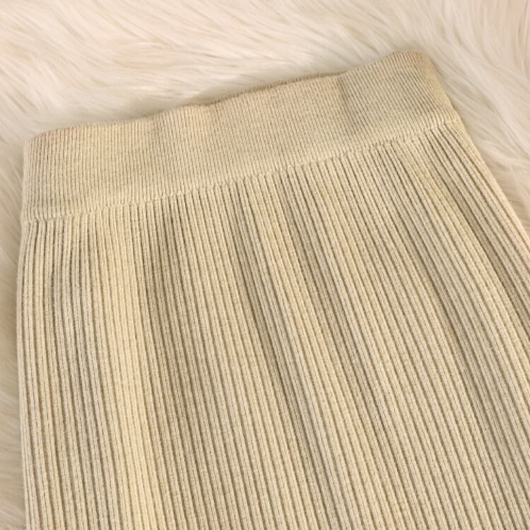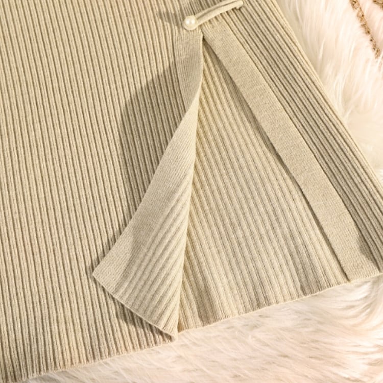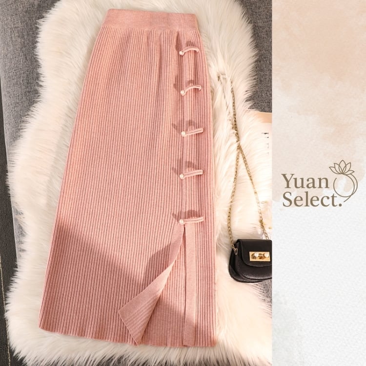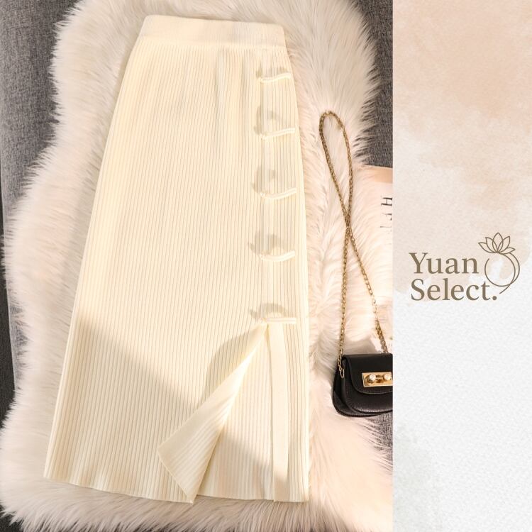 サイドに並ぶチャイナボタンがアクセントのリブニットタイトスカート。