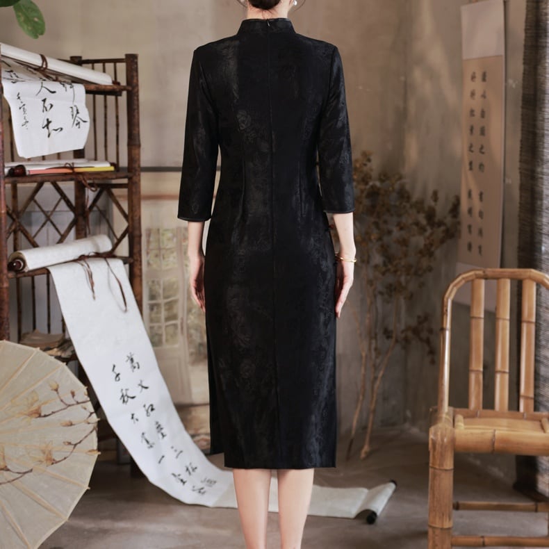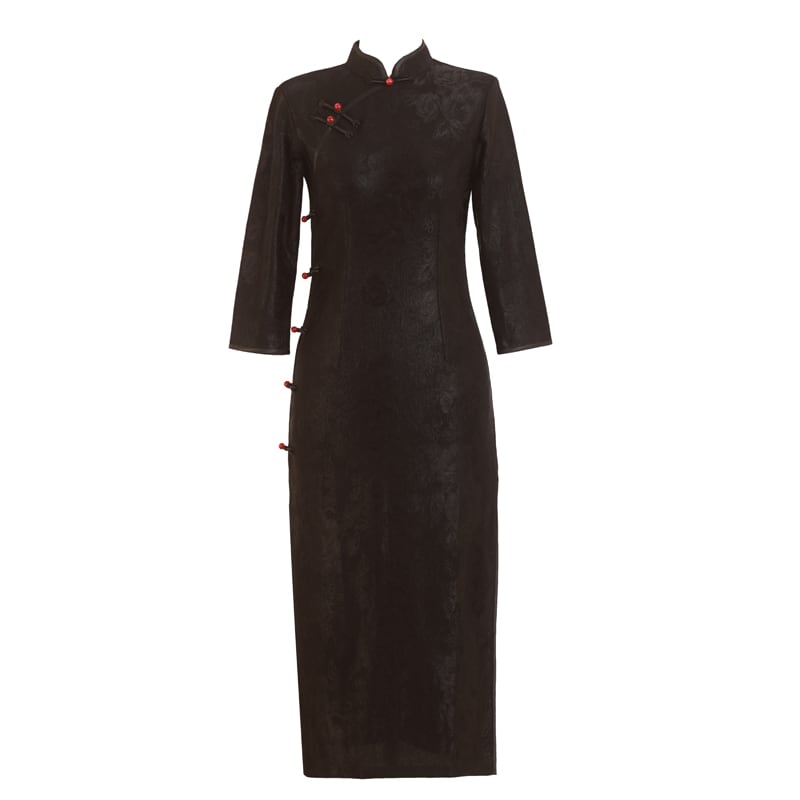 黒地に繊細な花文様を織り込んだジャカード生地を使用した旗袍ワンピース。