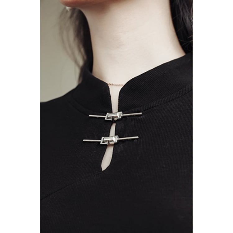 胸元にはチャイナボタンをモダンにアレンジした金属の留め具を配置。