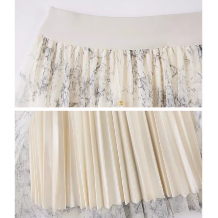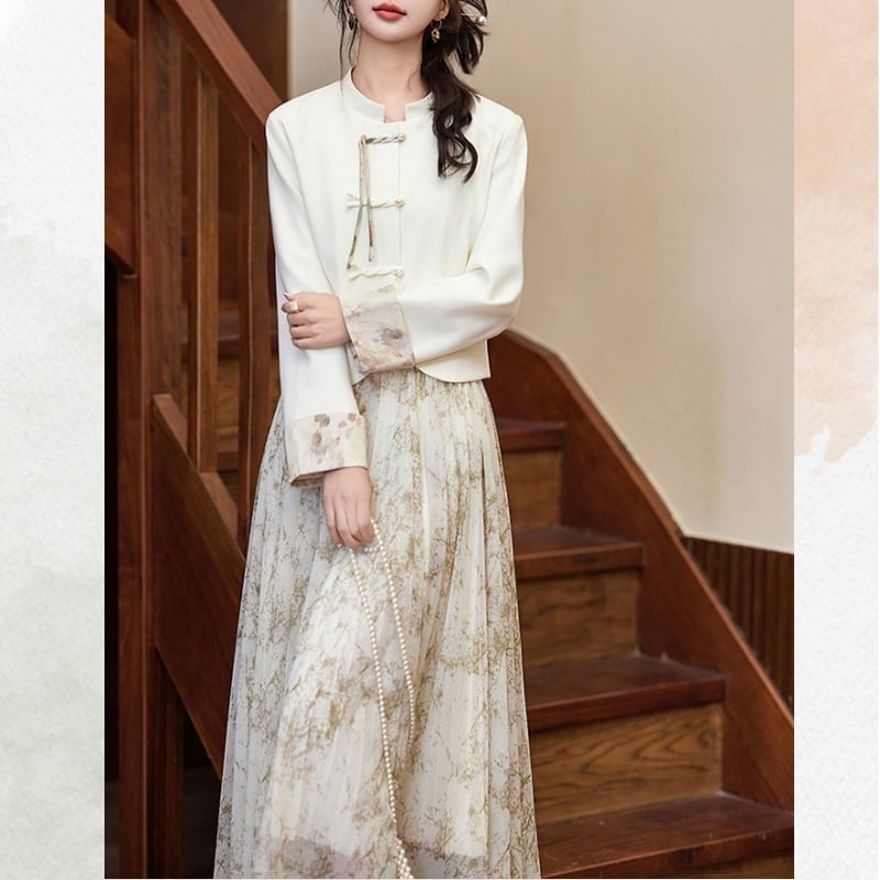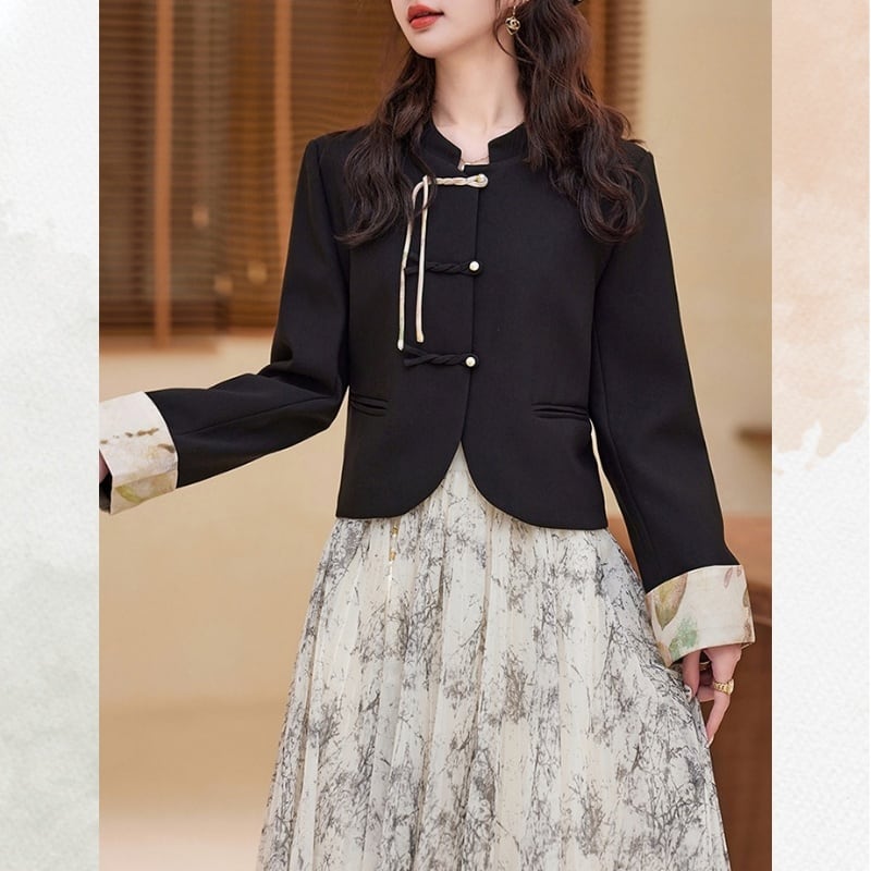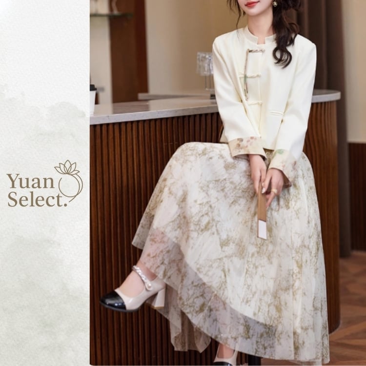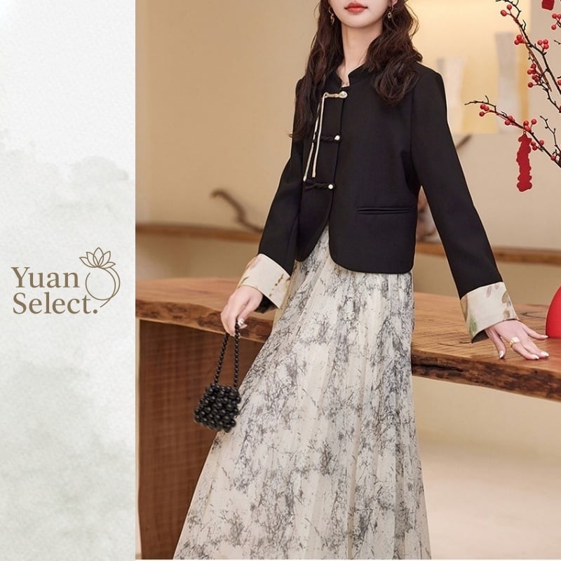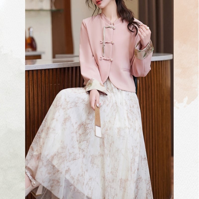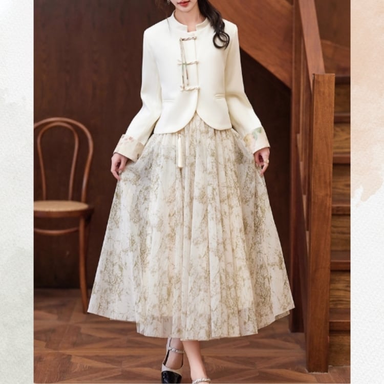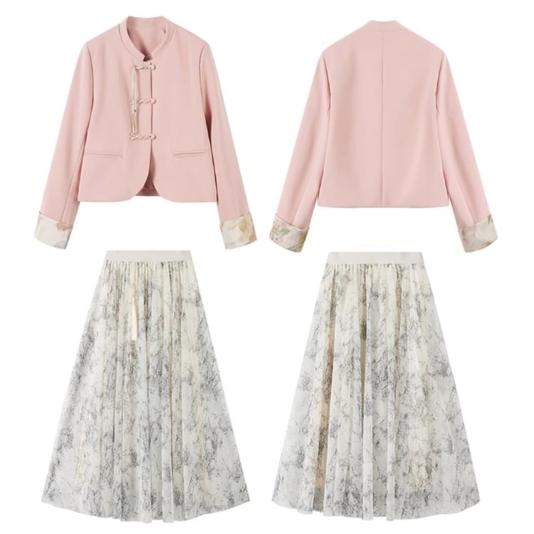 伝統的なチャイナボタンをあしらったジャケットと、流れるようなプリーツスカートを組み合わせたセットアップ。