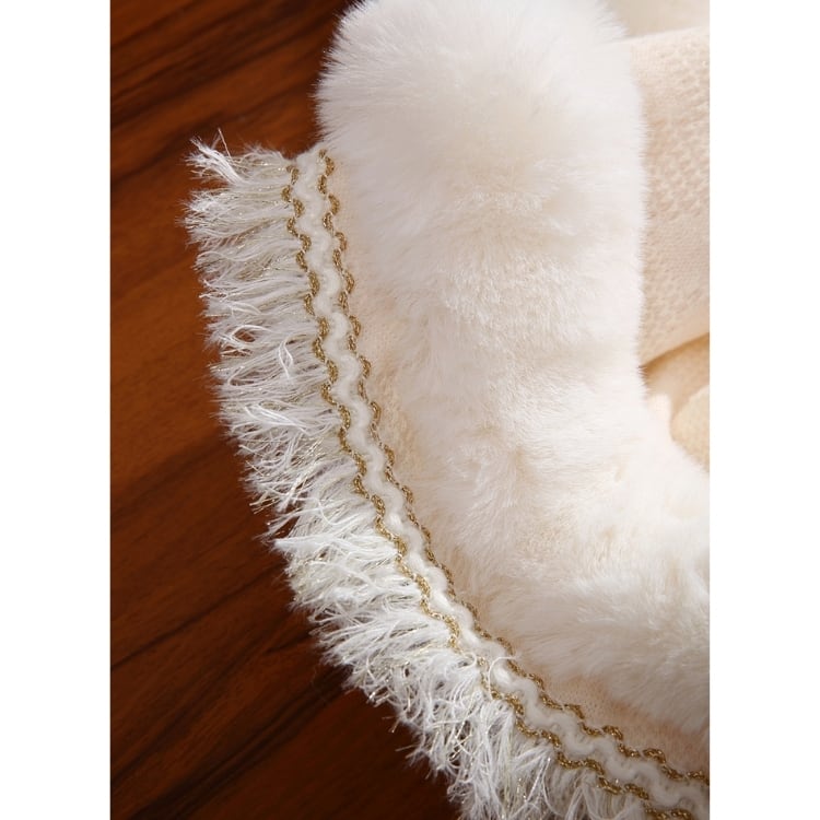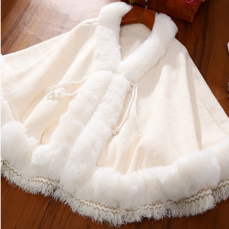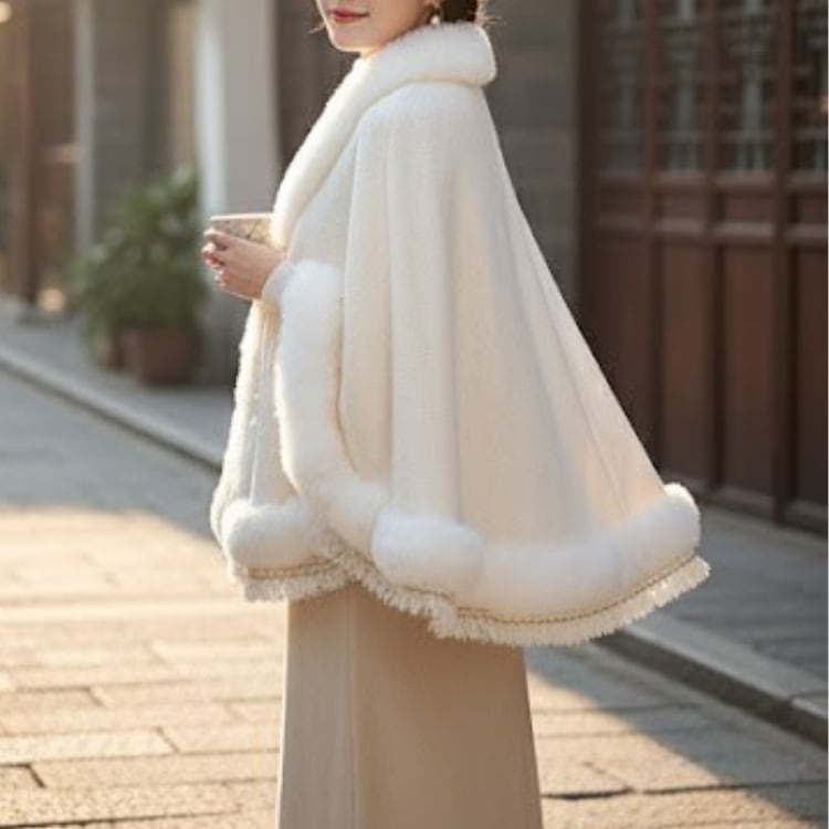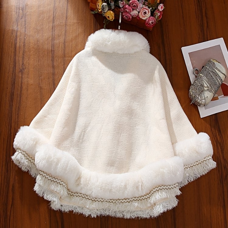 ふんわり柔らかなフェイクファーに、フリンジの縁取りを添えた上品なケープコート。