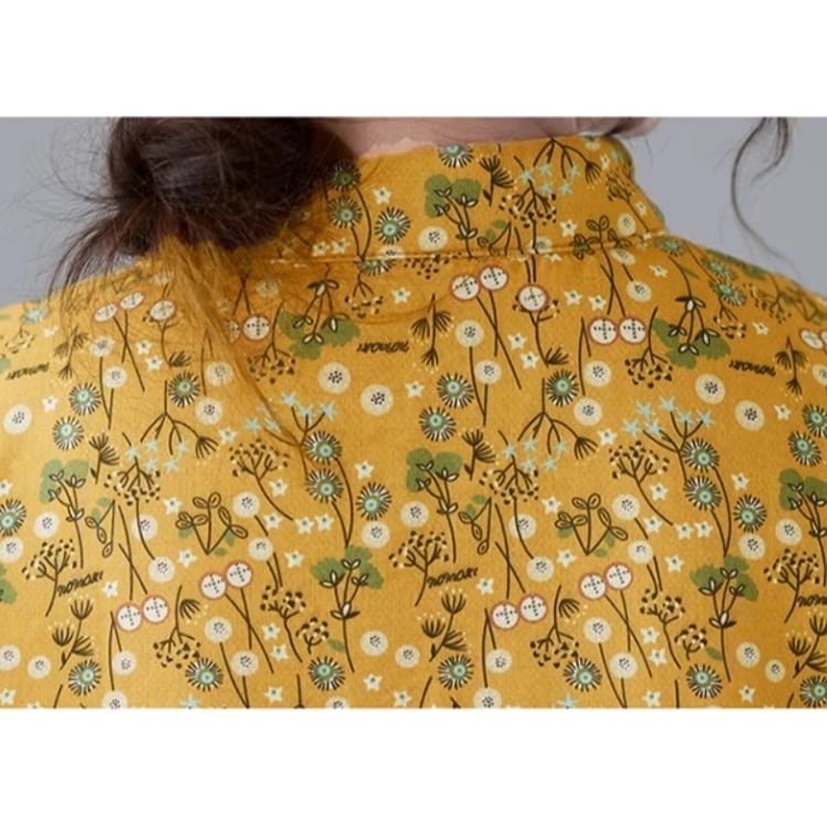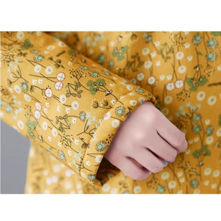 ふんわり厚手の生地に可憐な花柄をあしらい、首元のチャイナボタンがアクセントになっています。