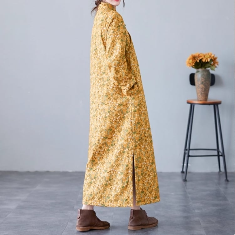 冬のお出かけにもぴったりの、あたたかみある中華風ロングワンピース。