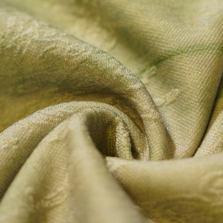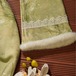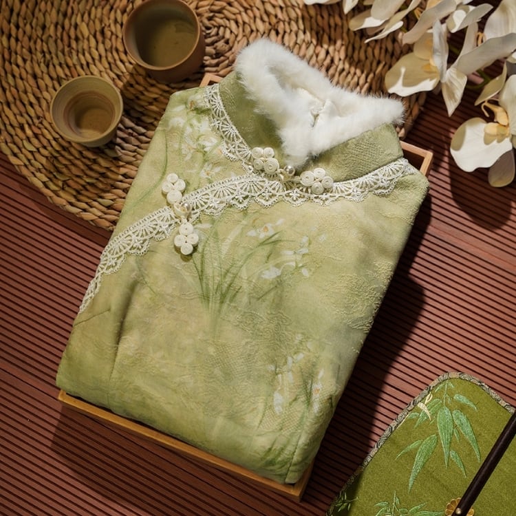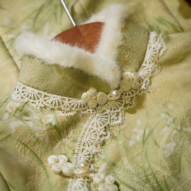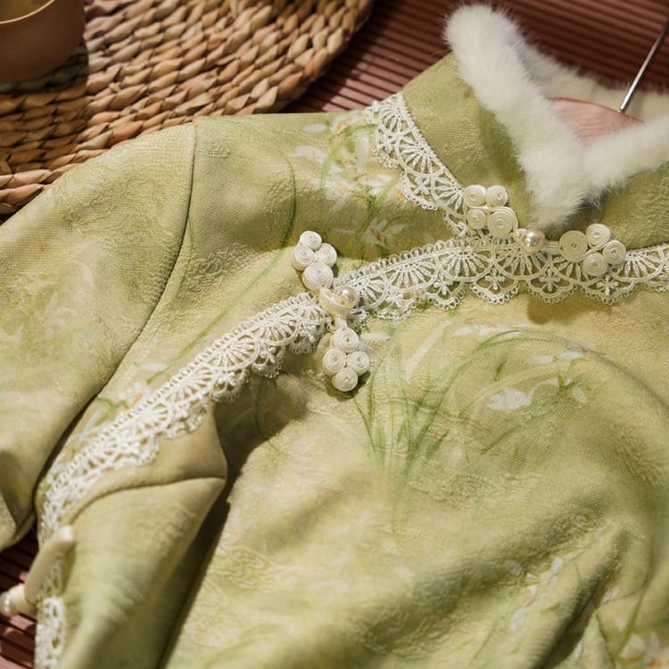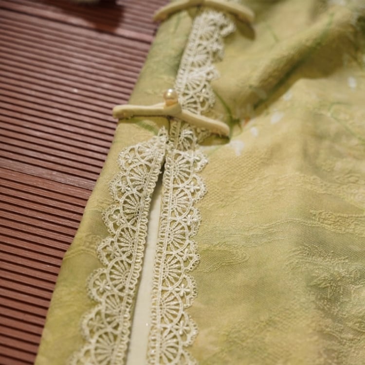 淡い若草色のジャガード生地に水仙の花を織り込んだ旗袍ワンピース。