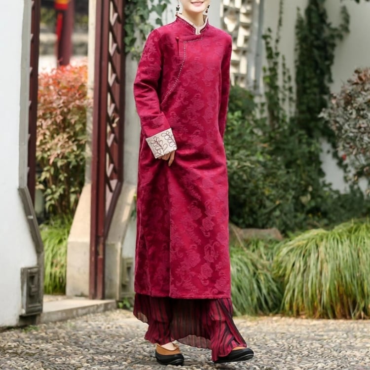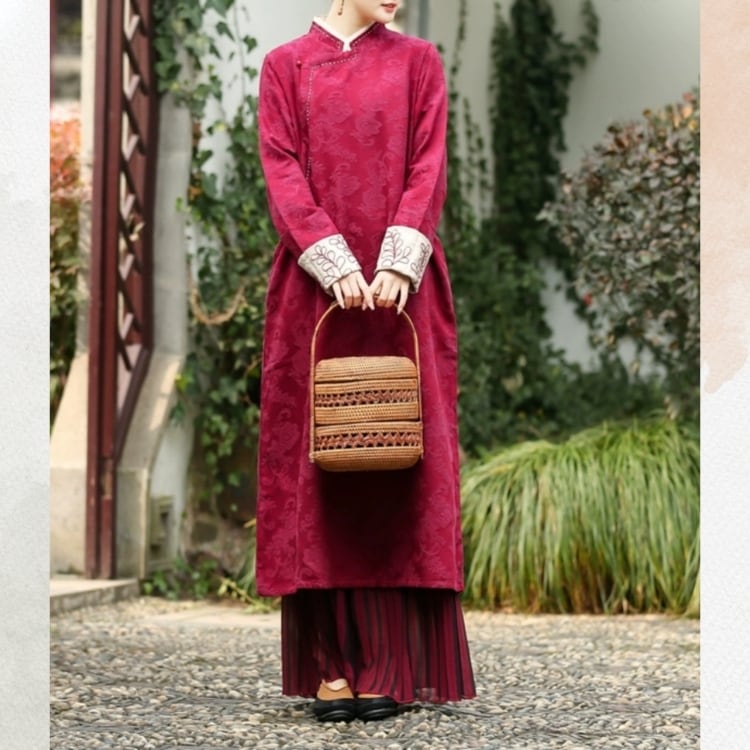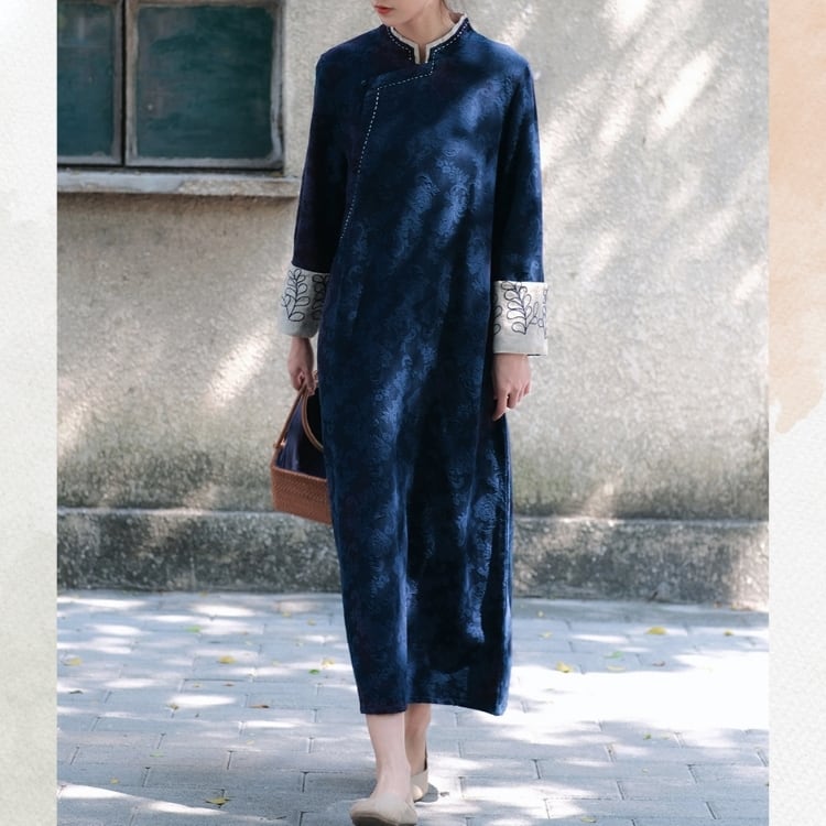 花模様のジャカード生地に、刺繍をあしらった袖口が映える旗袍風ワンピース。