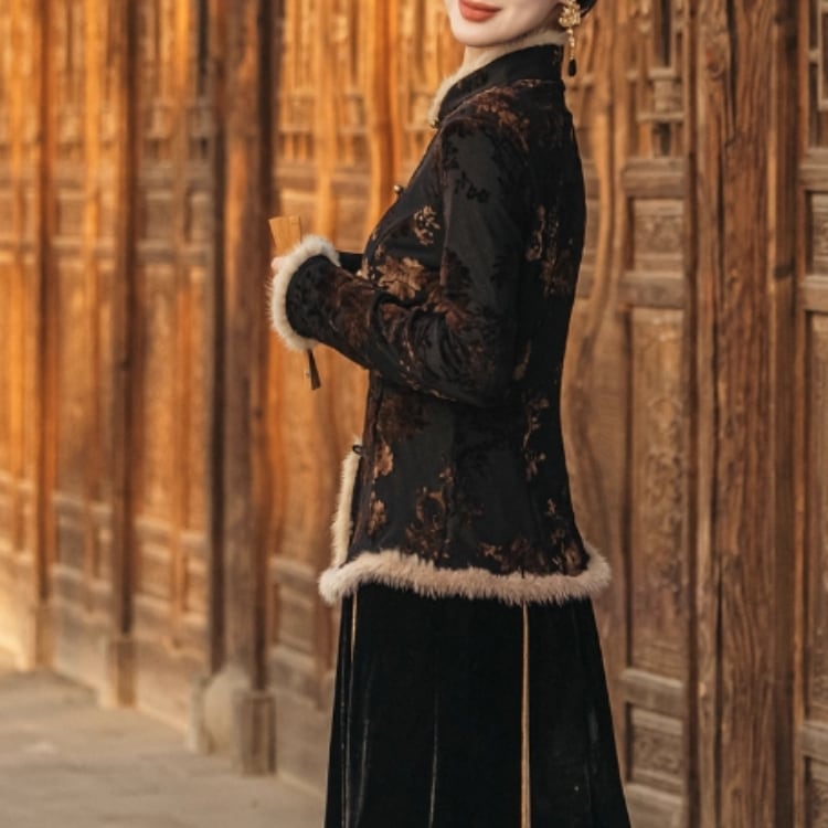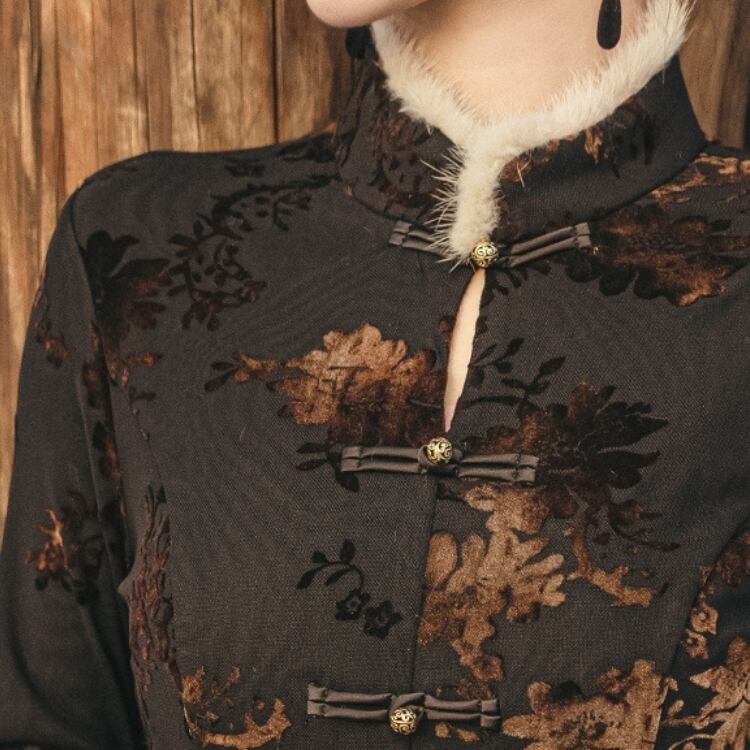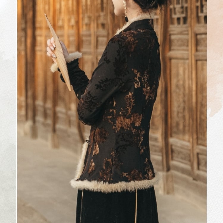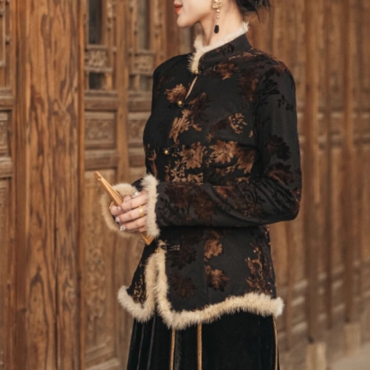 深みのある柄生地にフェイクファーを添えた、クラシックな雰囲気のチャイナトップス。