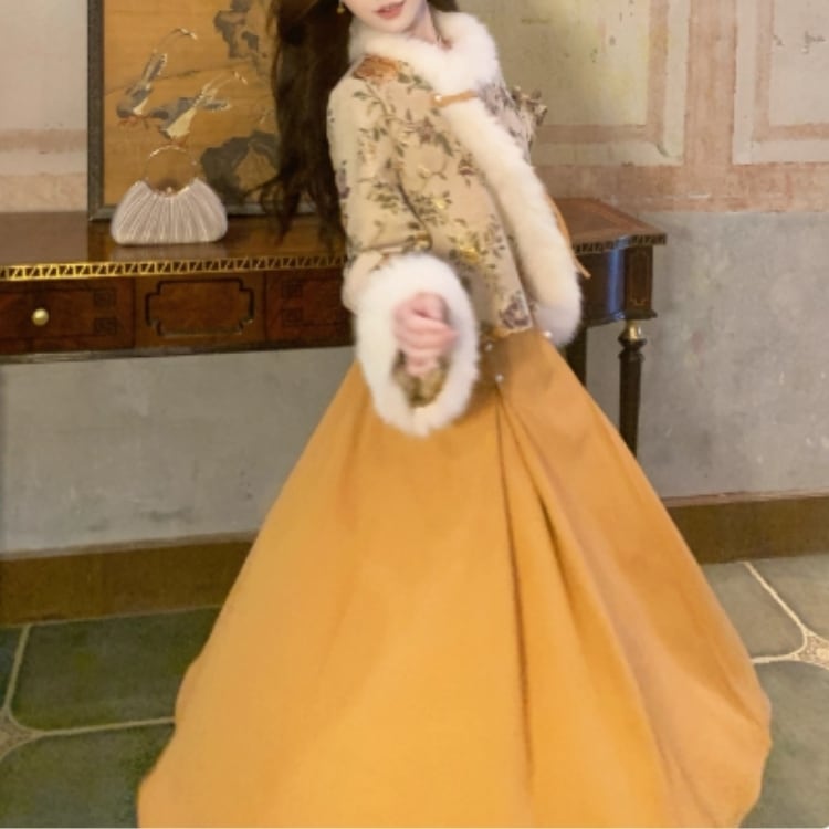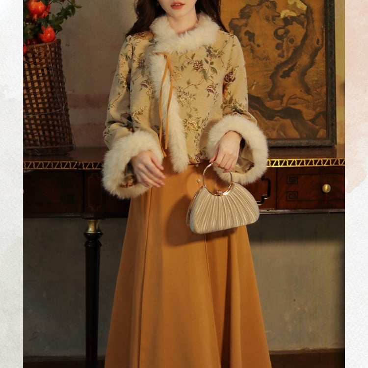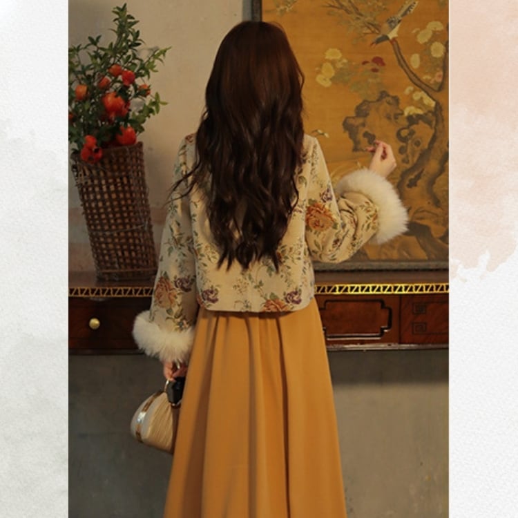 フェイクファー×花柄ジャカード エレガントチャイナセットアップ YS00224